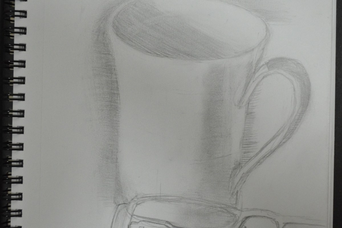 As the kettle started to boil I thought I would test myself to see if I could start to draw the coffee cup on the table and then finish sketching it after it had been moved and then put back in the same place. But as I began I realised that I had never been successful in drawing the delicate rim of a coffee cup but this time I was armed with a new technique. I lightly sketched the outline of the cup, hatched around the outside and inside the cup then took out the edges of the object with an eraser.