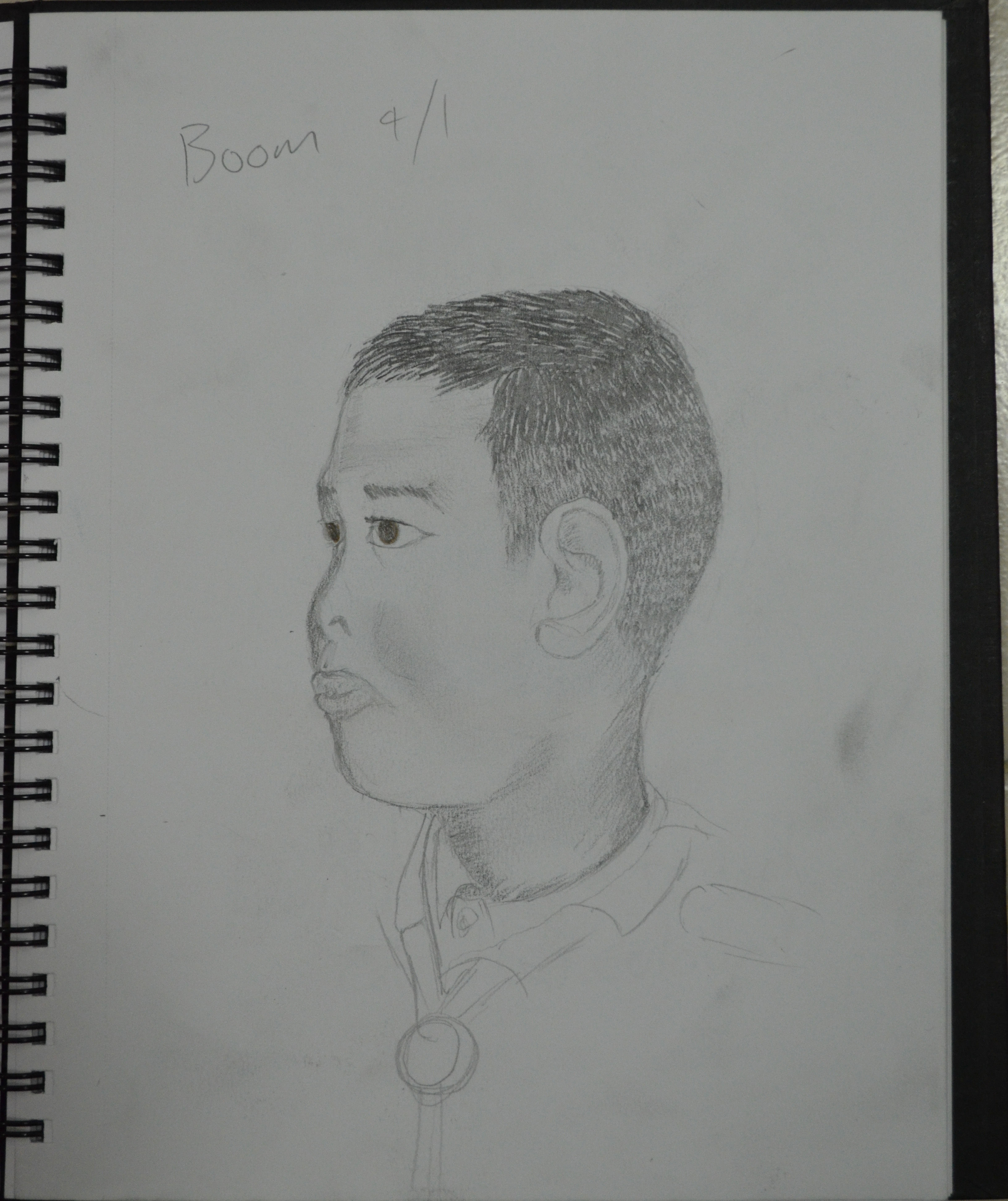 As my Thai students copied the oral test questions off the white board I found the perfect opportunity to practise drawing the head of a Thai child. The boy kept lifting his head up and down to browse the board which just added to the challenge however I will be finishing this off another time as certain features such as balloon lips and the uniquely shaped heads of Thai people are not something that I can finish off from memory. I would like to recreate this drawing again on large paper using colour.