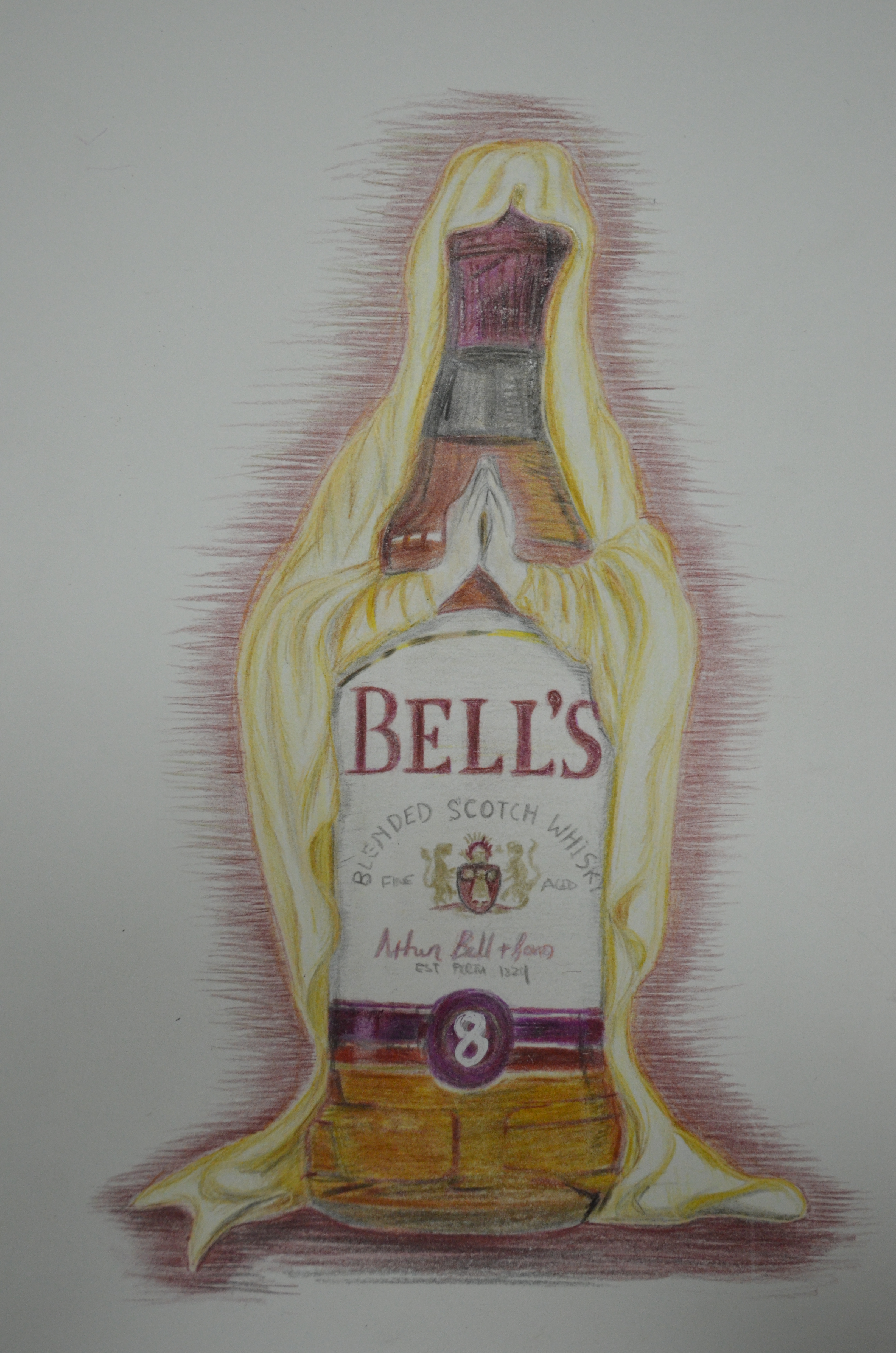 I have been wanting to create this image for the last year after seeing a statue of Mary on the TV and thinking that it had a similar shape to bottle of whisky. Originally it was planned for acrylic on canvas but after using colour pencils on the last exercise ‘Mark Making Techniques’ I decided to get it down on paper in coloured pencils while it was still fresh in my mind.