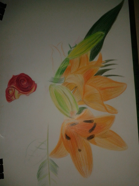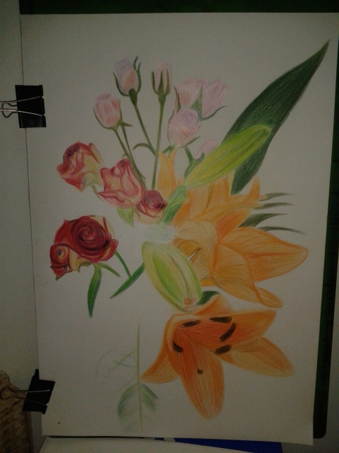 For this exercise I bought an assortment of flowers from the Tops supermarket while I was visiting my kids for a meal for my oldest daughters Birthday. The flowers I chose were orchids and some red and pink roses, I really was not thinking about shapes or colour when I purchased them but I am glad I made the choices that I did. On an A2 sheet of white paper I began to draw.