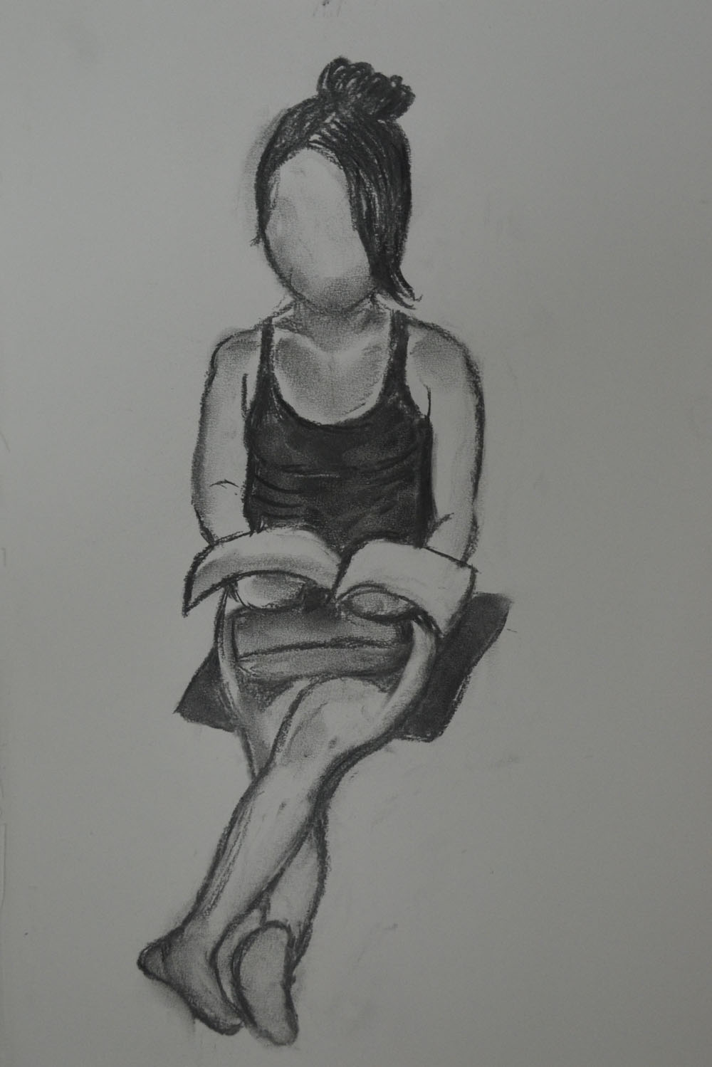 I started with a practise sketch to get me used to drawing with charcoal on the large A2 pad. For this I let the girlfriend sit on the floor with her back against the bed. She lives in a studio apartment which is basically a bedsit. The proportions were out as there wasn’t much measuring going what I really wanted to know from this trial drawing was how well I was going to work with compressed charcoal on the large sheets of paper.