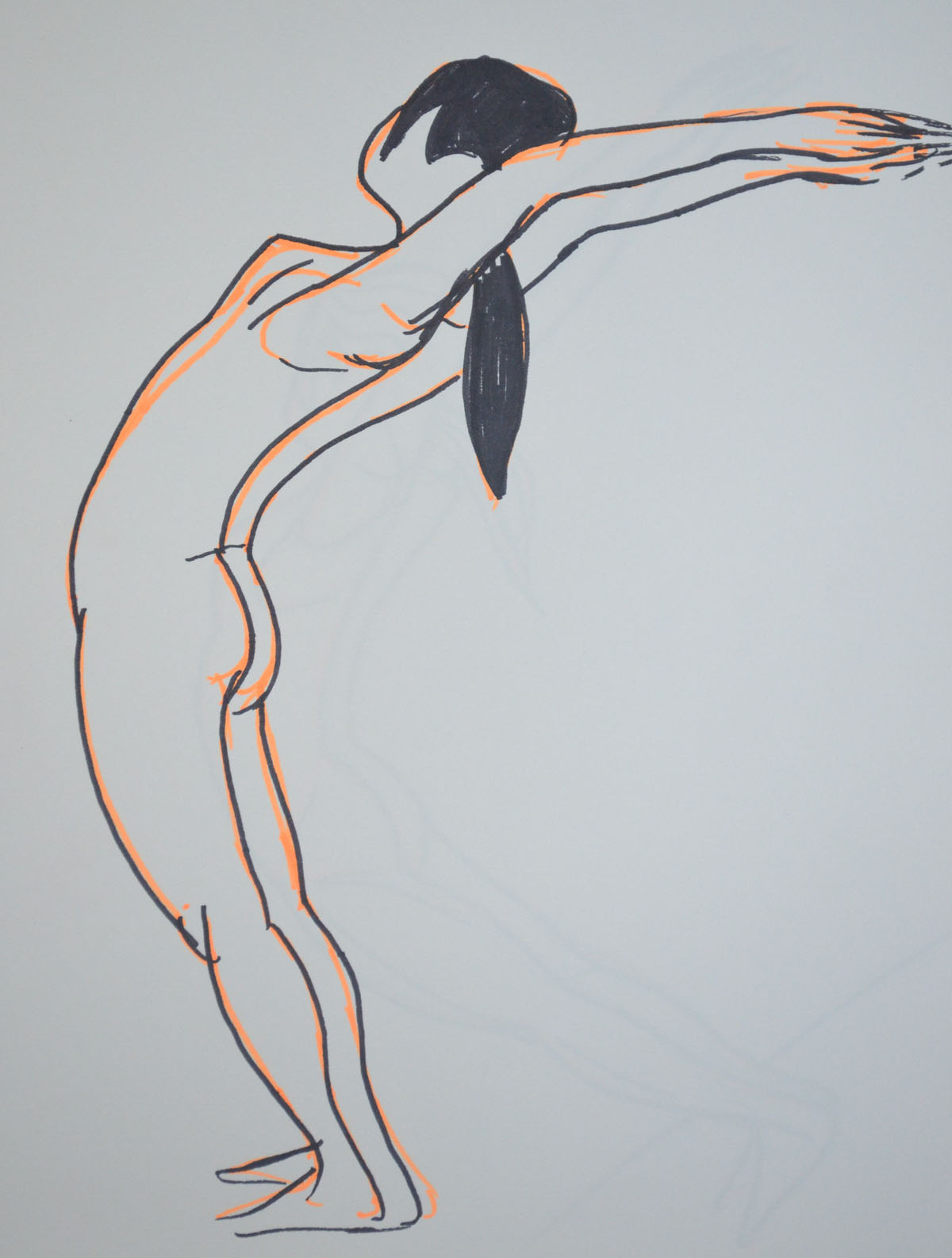 The Shiva Dancing Pose above is a very static pose but I thought by using the vibrant orange to sketch in the form first before I went over it in black it would give it some energy. I don’t think it does, my students think it does, nonetheless it does remind me of Degas’s ballerinas.