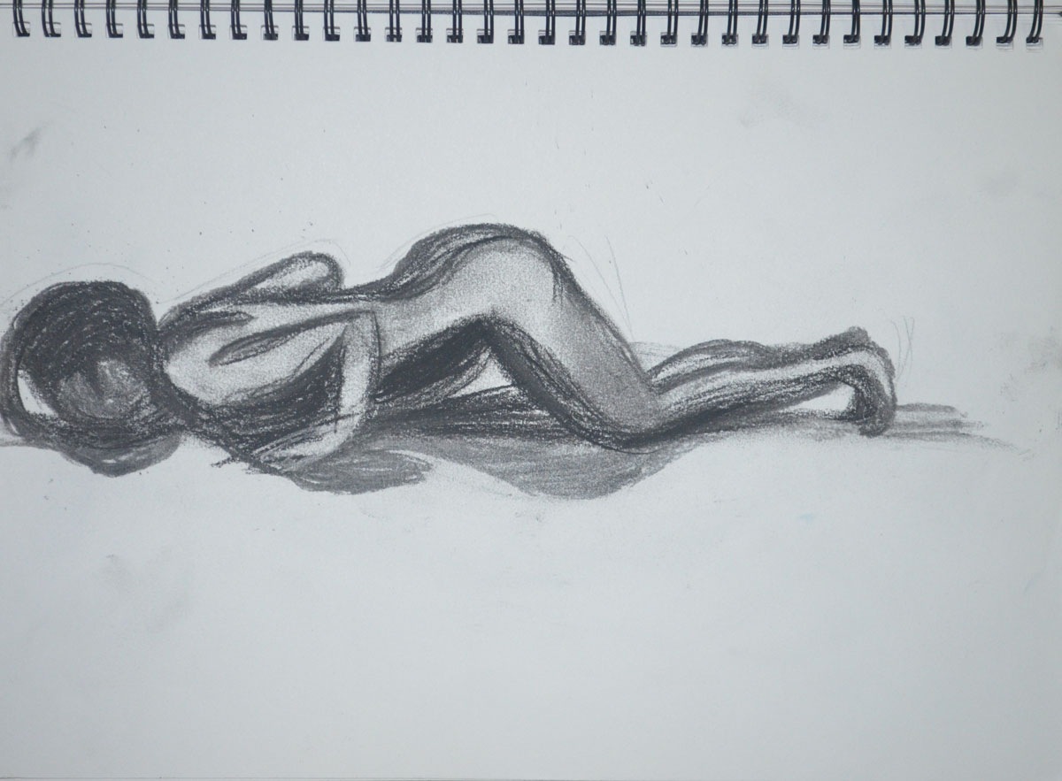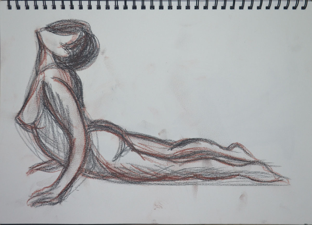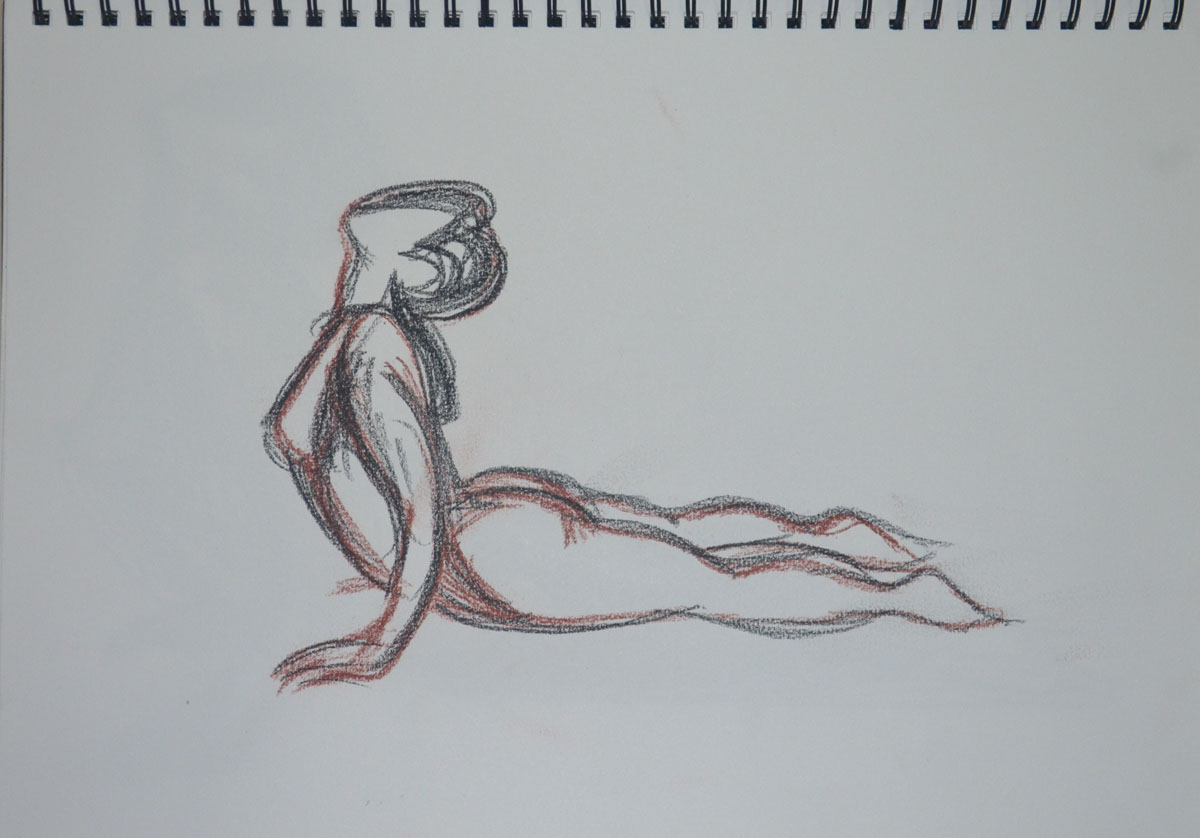 The second drawing of the same pose was a lot easier for us both and this time I started with longer lines from the waist to the breast then from the breast to the wrist then worked my way down to the floor. Her hair flicked back gave me an idea and so i decided to add some trail lines to both drawings, successfully adding energy and movement to the drawings. For the next two drawings we chose the ‘Knees, chest and chin pose’ as I thought, like the Cobra Pose, drawing with energy I may be able to depict movement in the following sketches. This maybe true for the Conte sketch in two colours but not the drawing in charcoal.