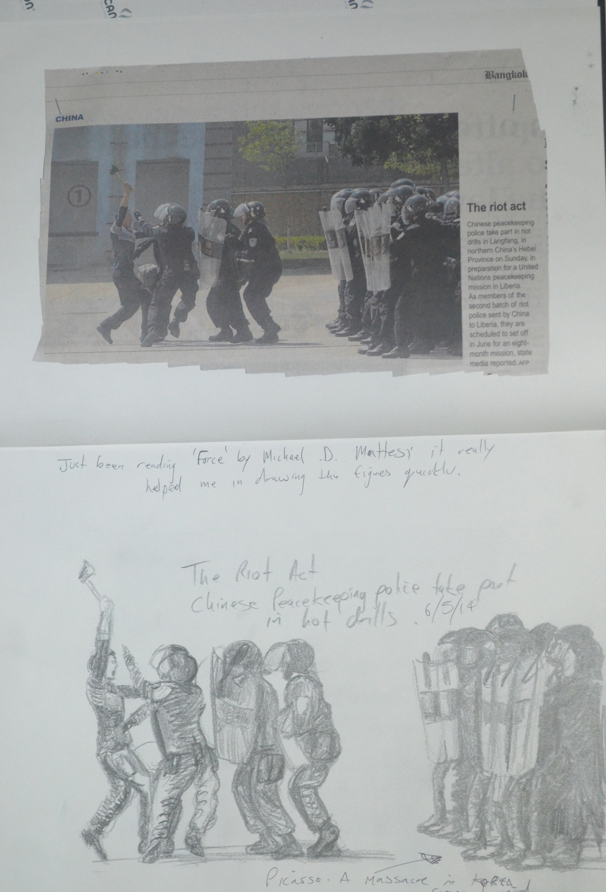 The first newspaper article was from the international news section, about the riot police in China having drills, so in a 6B pencil I tried recreate the image depicting as much movement as possible,