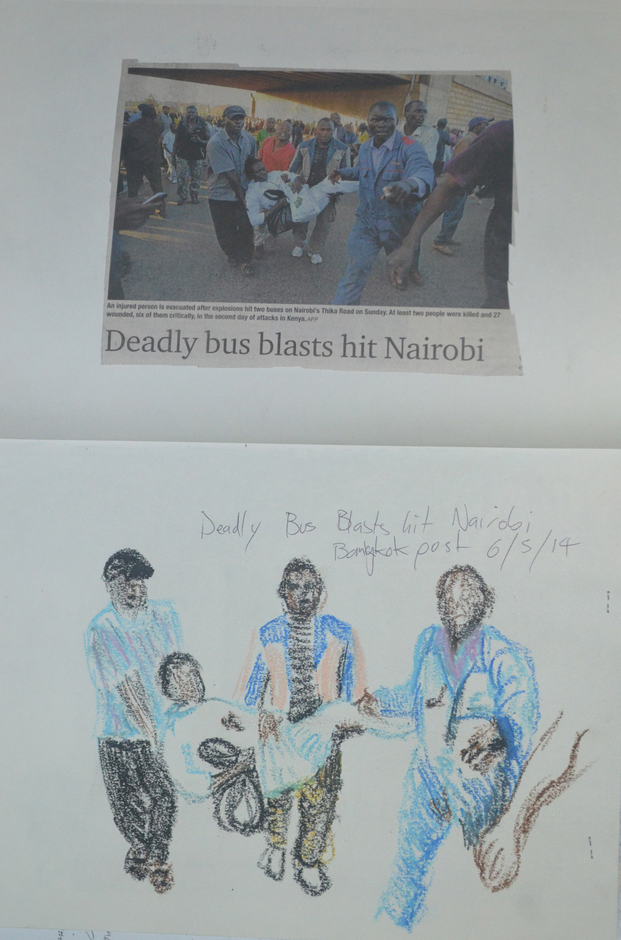 The second scene was a bombing in Nairobi, three rescuers carrying a possible fatality away from the blast. I chose to draw this in oil pastel as fast as possible and I think I did quite well to depict movement in the very rough sketch.