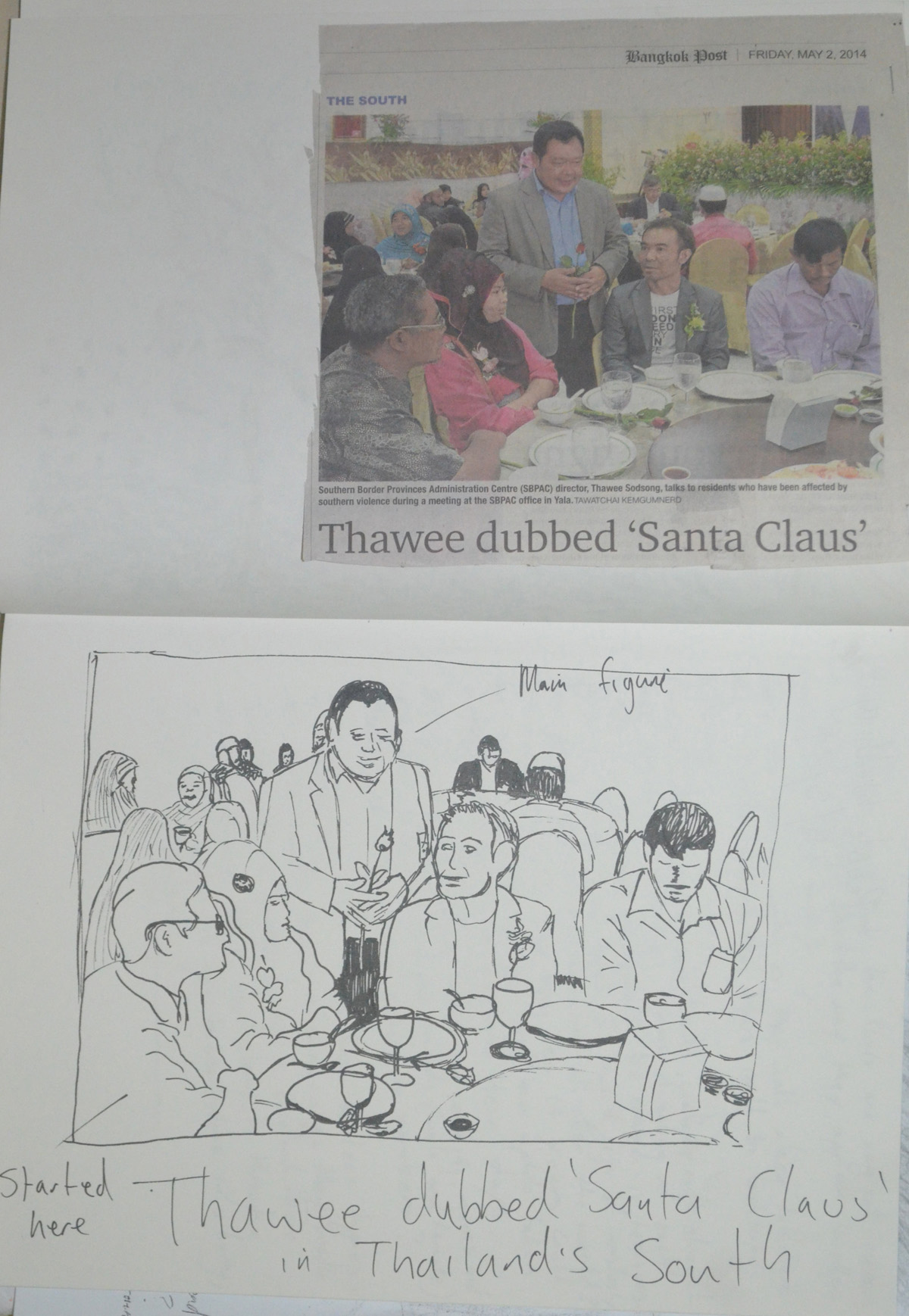 The next drawing was from a news article about some politician being nicknamed Santa Claus in Thailand’s troubled south. I built up the scene from the guy in the bottom right hand corner and worked my way around the table, from there I drew in the main character, hence not in proportion and then went onto draw the background.