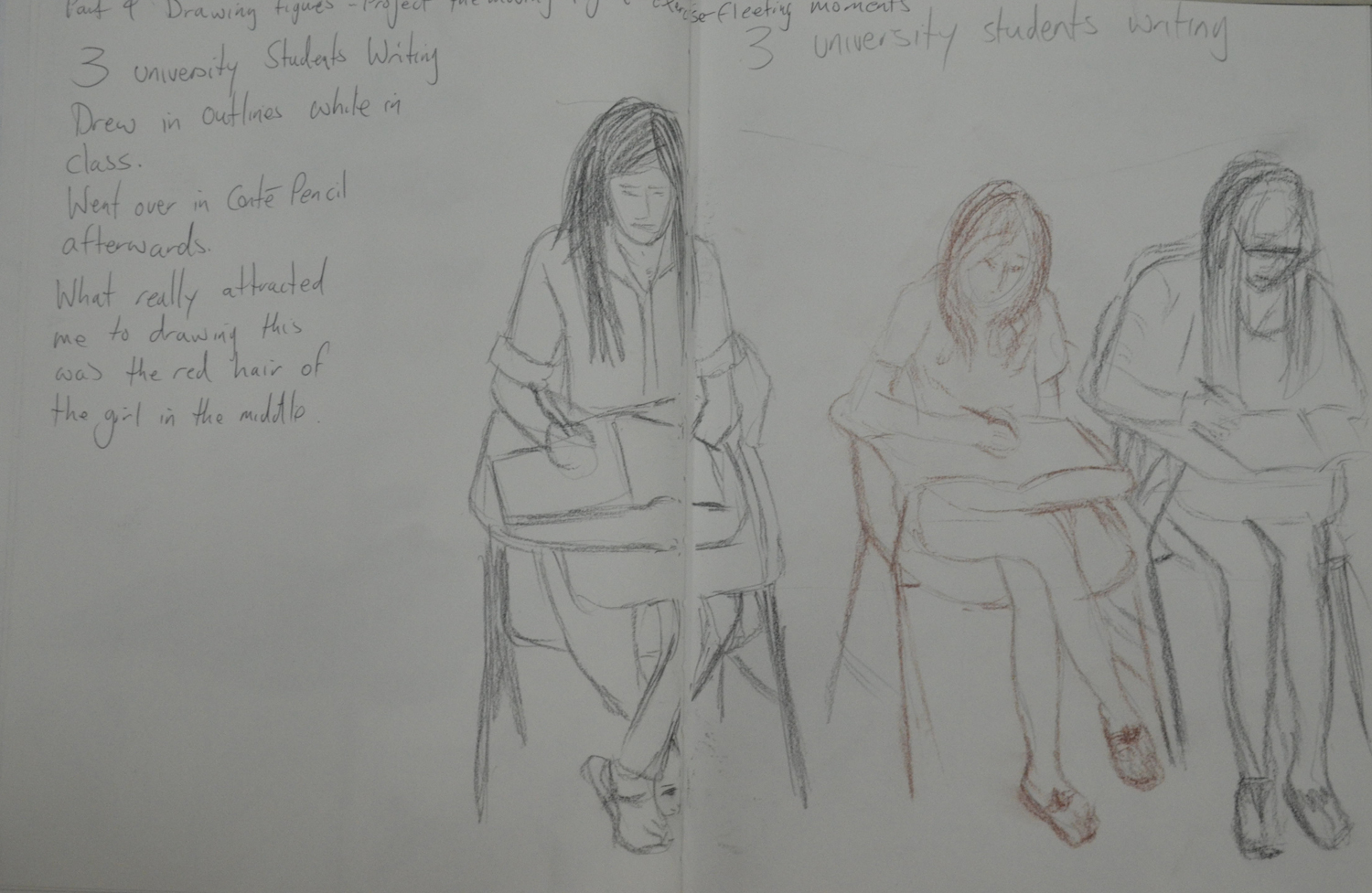 That morning I was supposed to be teaching 3 students in a private class but everyone had cancelled, luckily for me I had made some very quick pencil sketches of the three students the day before noting their height and frame and how they were sitting and decided to go over them with a more detailed sketch from what I could remember, clothes, hairstyle etc. I haven’t taught them since so I haven’t been able to check if there was any likeness there.