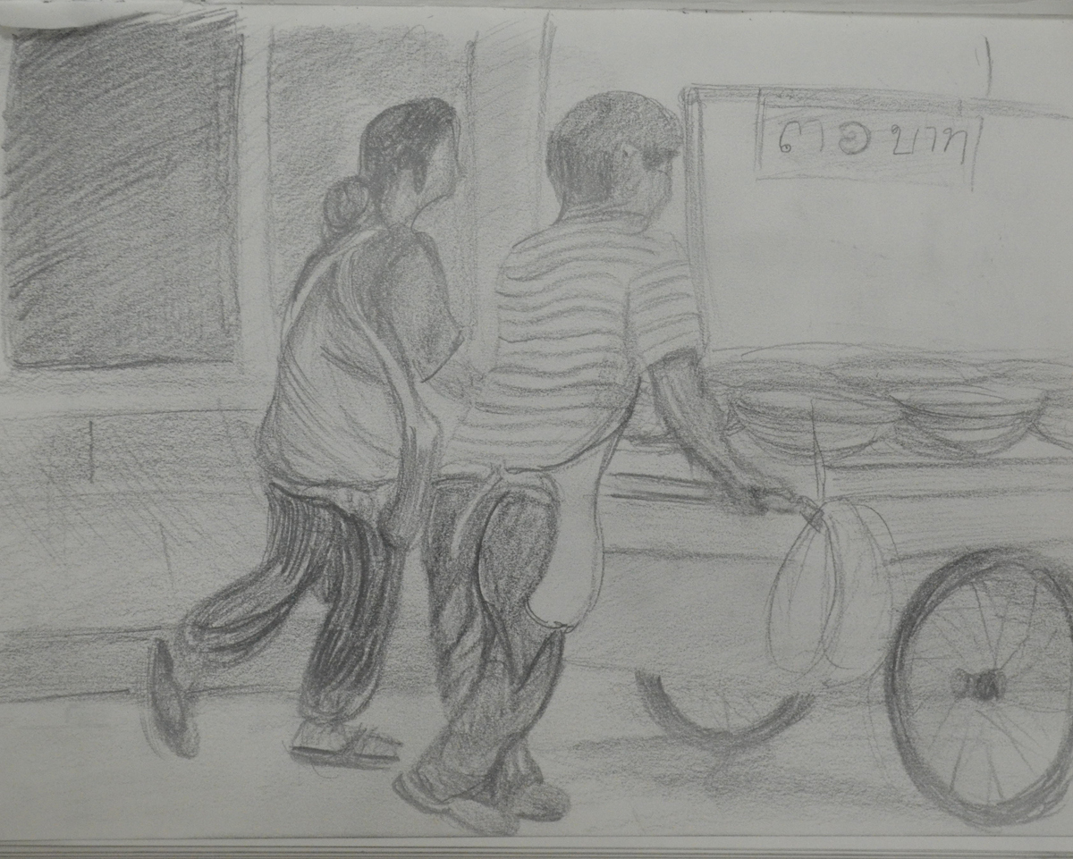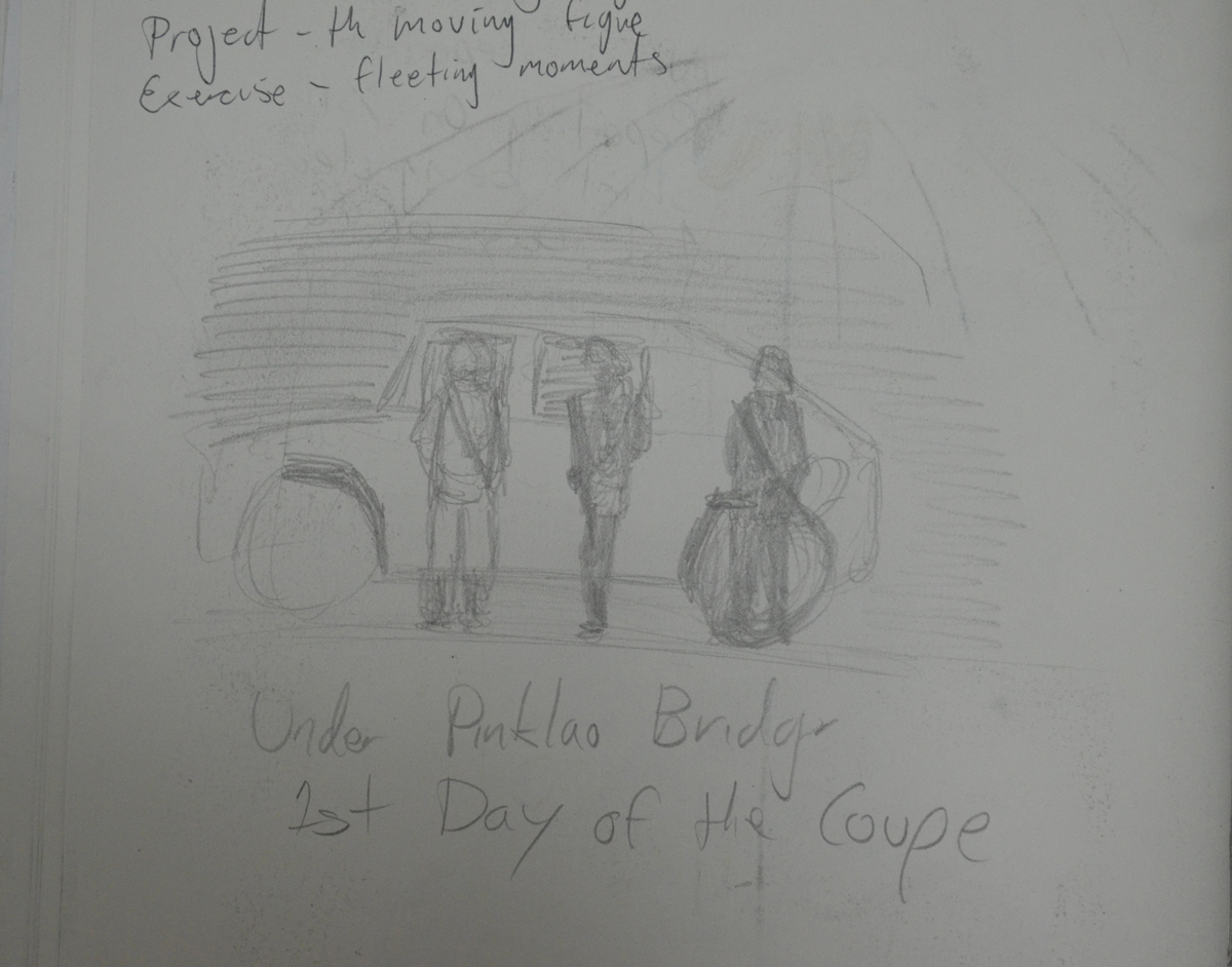 That afternoon on my way to taking my computer to repaired I got my first glimpse of the army, stationed (or hiding from the sun) under the flyover at Pinklao intersection, two of them stood on top of the bridge with their backs to me and three of them stood by a Chinese knock off of a hummer. I made a quick drawing of what I remembered about the three stood by the hummer while the guy checked to see if my computer was worth repairing.