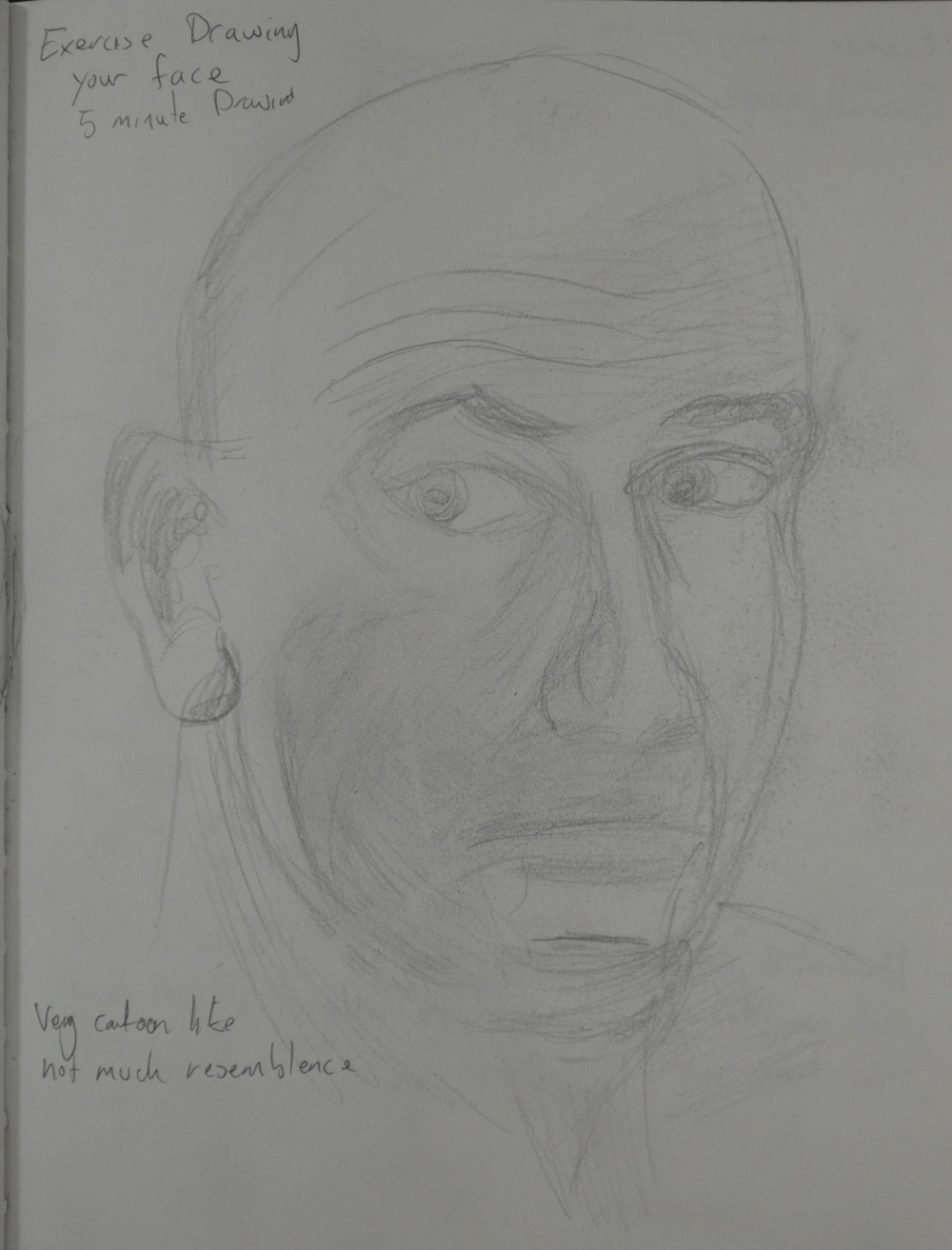 The third sketch was done looking into my bedroom wardrobe door, with the bedroom light on the right of me it cast some really dark shadows across my face. Even though others would probably say that it did not look like me and I actually wrote that it did not resemble me but every time I look at it I see more of myself in the drawing.