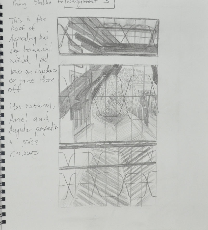 The third sketch was from the window of the classroom on the top floor, which all though had most of everything, the tree in the view wasn’t very big at all and so after a second larger (partial) sketch on A3 I decided that I was to go with the view from the 2nd floor window.