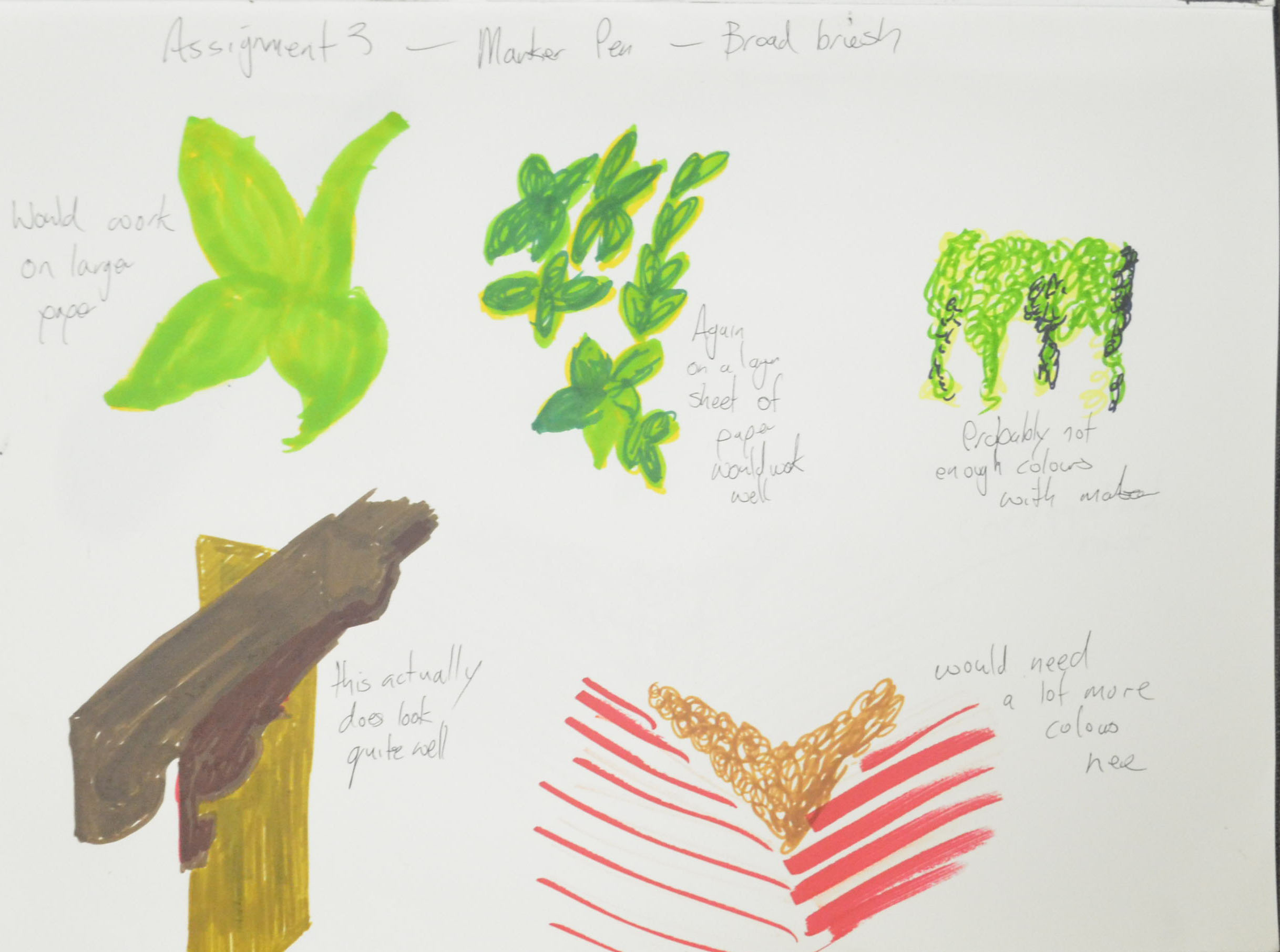 Still, even though I had already made my mind up the Assignment  had asked for broad brush stroke studies to decide on the colours I would use for the final drawing so I tried a couple of mediums that were very different to what I had decided on drawing for the final drawing.
