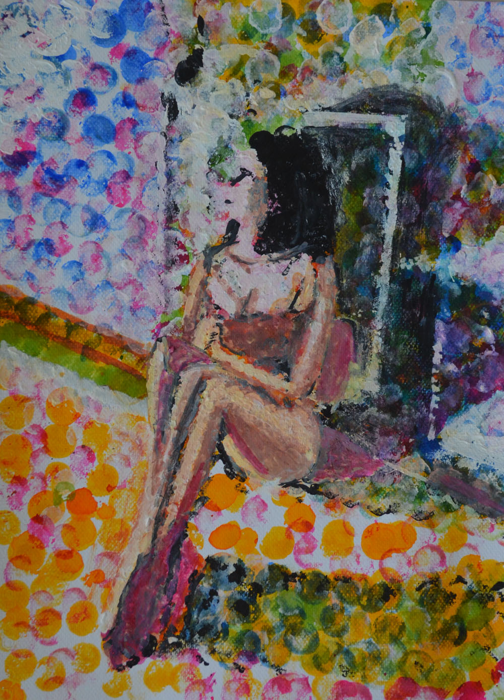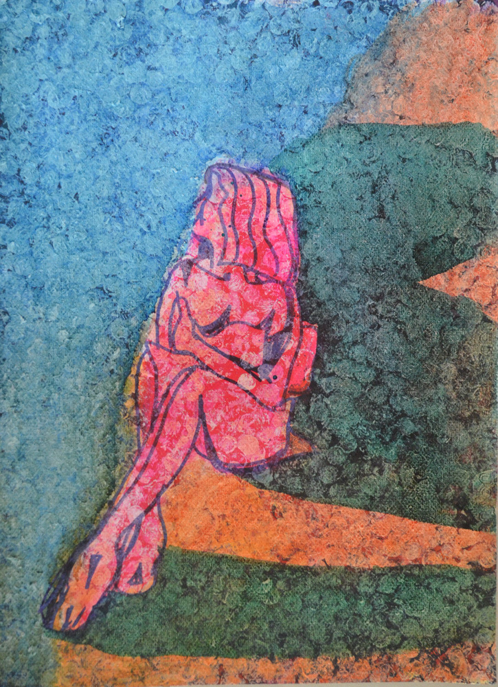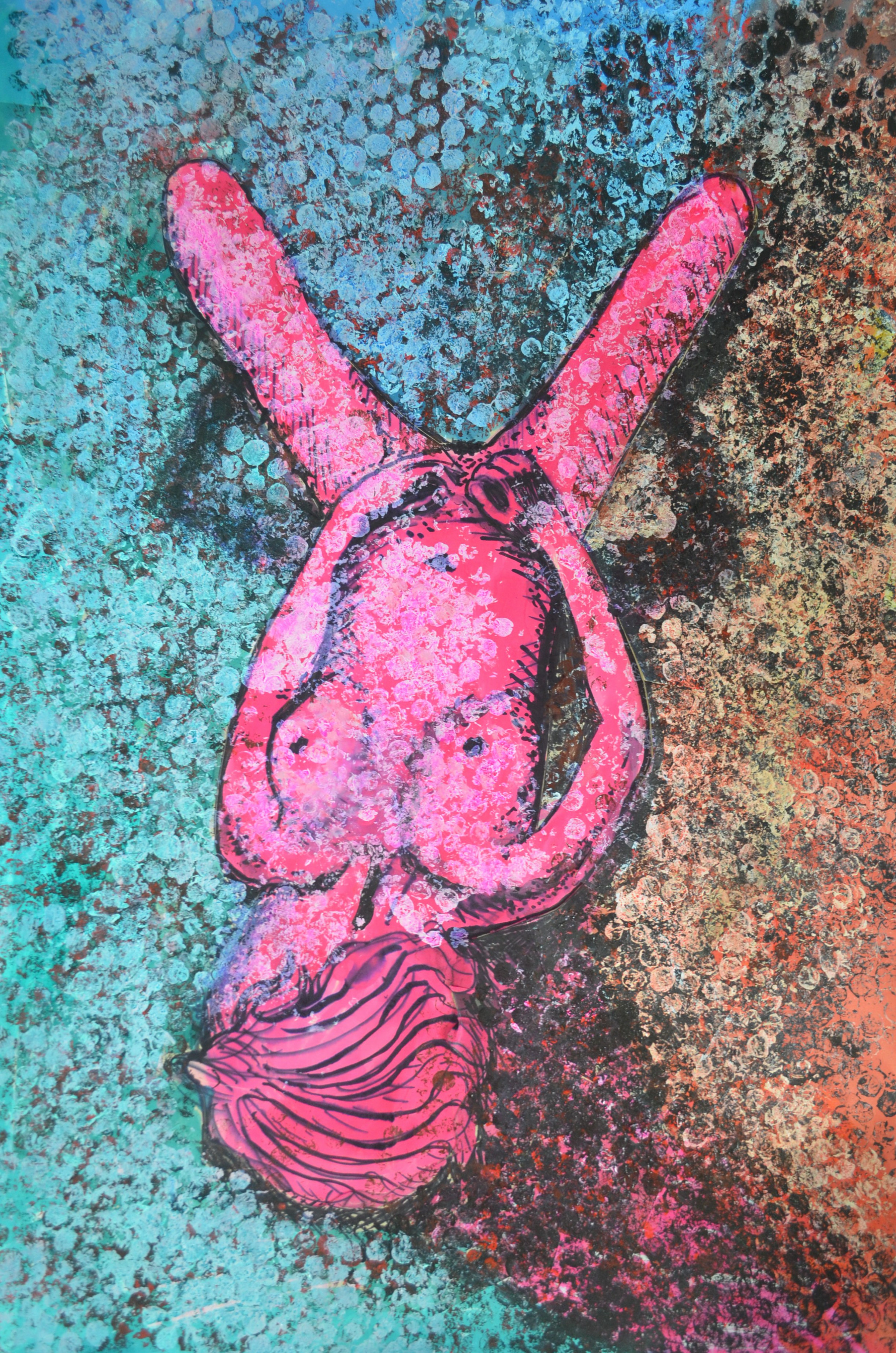 I decided to have another go at the acrylic>bubble wrap> ink technique as I wasn’t happy that I had to throw away the drawing and so I did a little bit more experimenting before trying to have a go at a finished piece. This time the colour order didn’t suit the pose as the lighter colours should have been on the left of the figure. I also made the mistake of applying white acrylic to the figure then going over it with pink ink and marker, these didn’t take well over the acrylic and so I decided to have one last try.