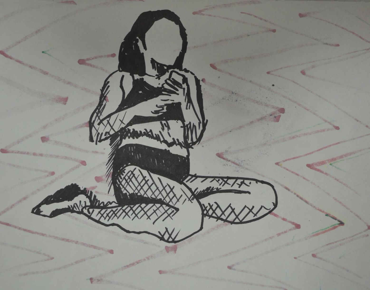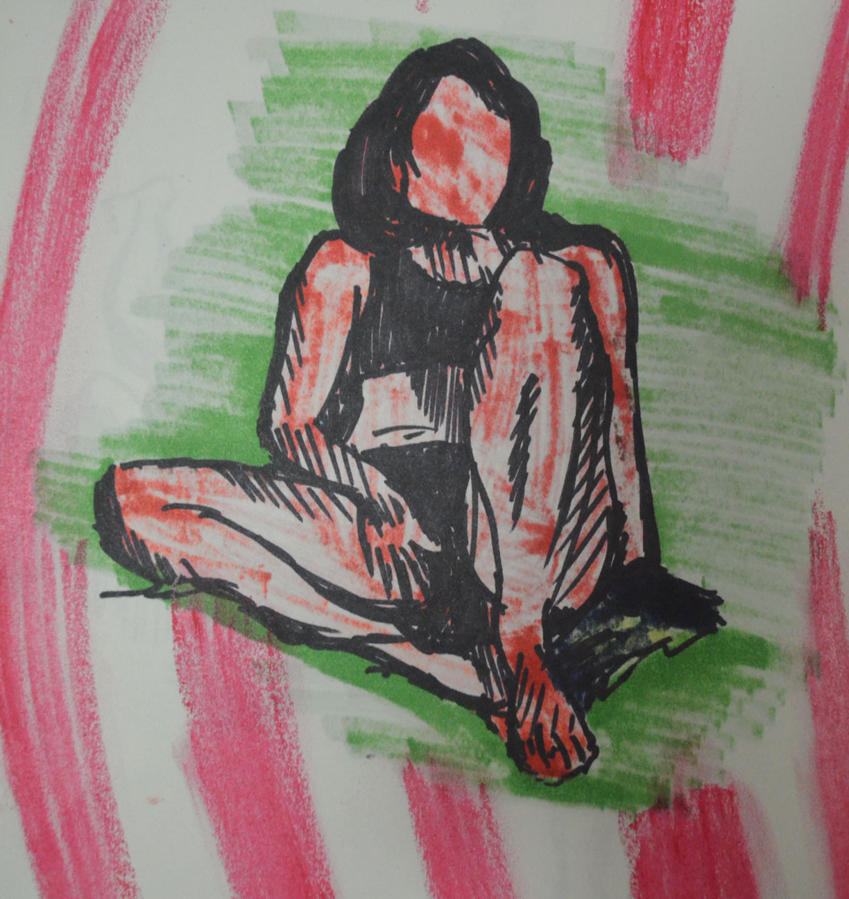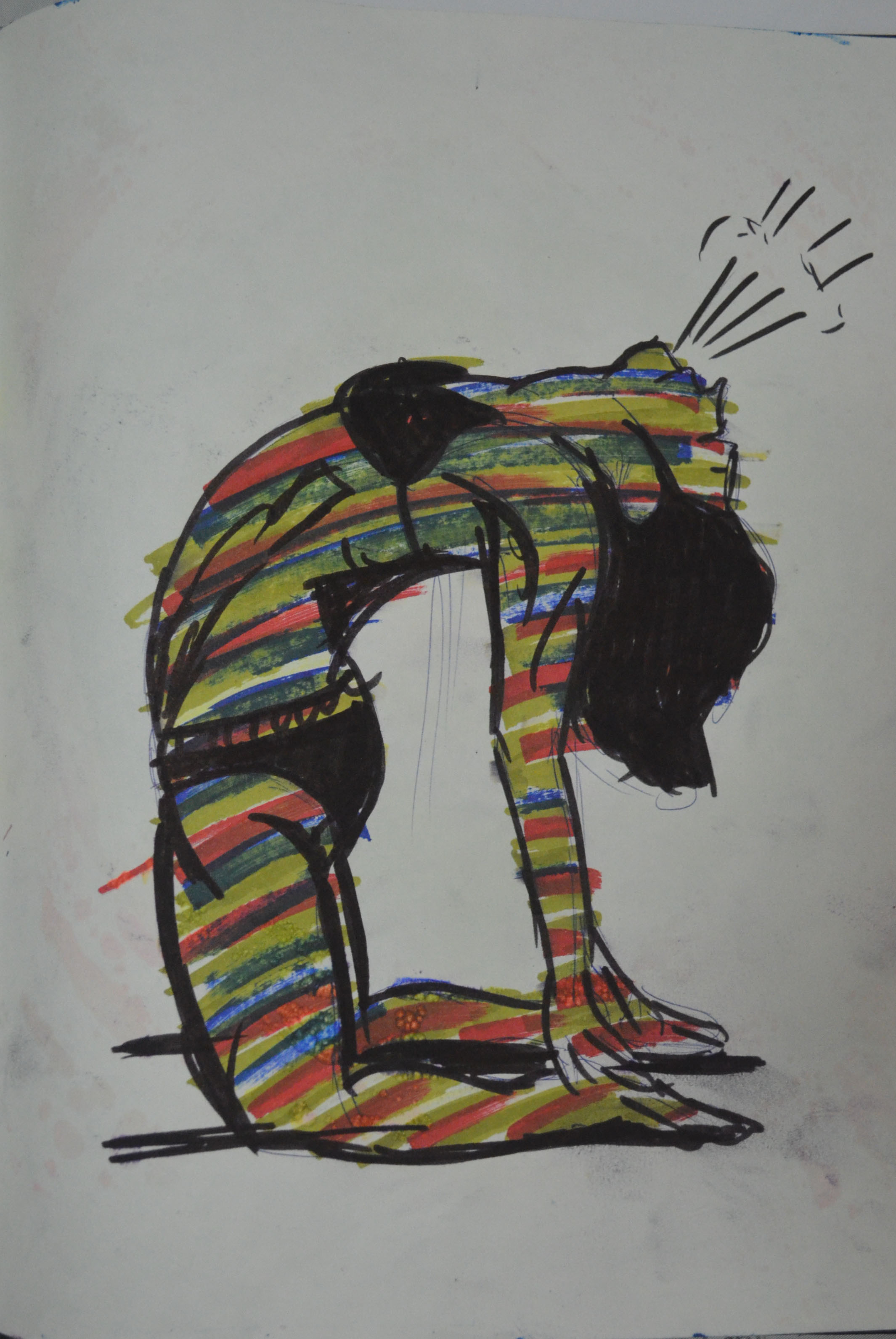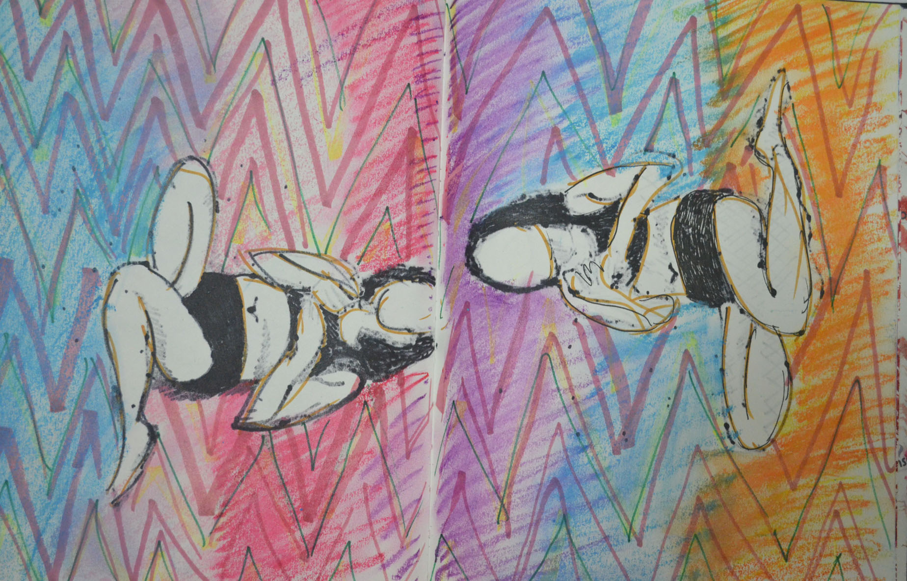 I began the next drawing by laying down random marker lines and then filling in the white gaps with pink, from there I drew a fresh pose from a series of photos that I took on the beach. Then I drew a similar pose on a plain page and then drew within the shape of the body with darker colours.