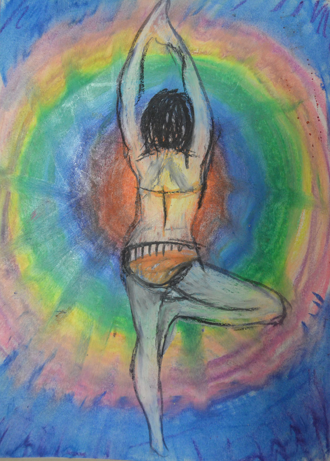 I started the next drawing by drawing in circles with the oil pastels and then blending them with my finger. I knew I would draw a figure over the top but i wasn’t sure which pose or how i would finish the experiment. I don’t know why I chose the pose below but it worked out well. To complete the drawing I first sprayed the bottom layer with hairspray then I drew the figure in a fine black marker before filling the figure in white oil pastel and then drawing in the details. I love the way her back glows due to the yellow in the centre of the bottom layer.
