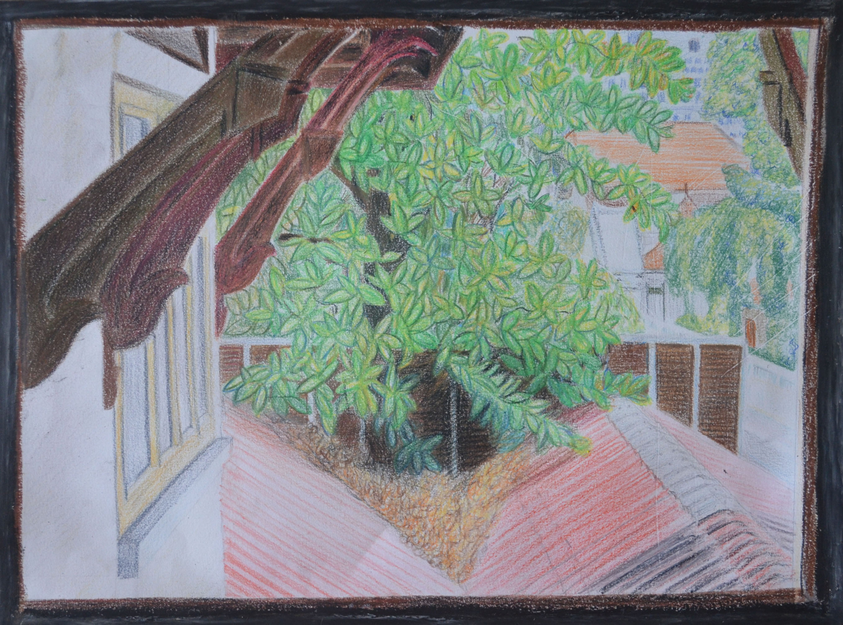 On my tutor’s advice to be a little bit bolder in the depiction of the light and shade created by the layers of leaves I attempted to go over the leaves in the original picture with coloured pencil to try to depict light and shade. Because I had already used fixatives they didn’t layer very well. In the original drawing I had used grey oil pastel as a frame to try to depict the dirty inside walls of the school which I don’t think worked very well, the paper was also torn where I had removed it from the sketchbook, I went over the grey in black and trimmed the paper.