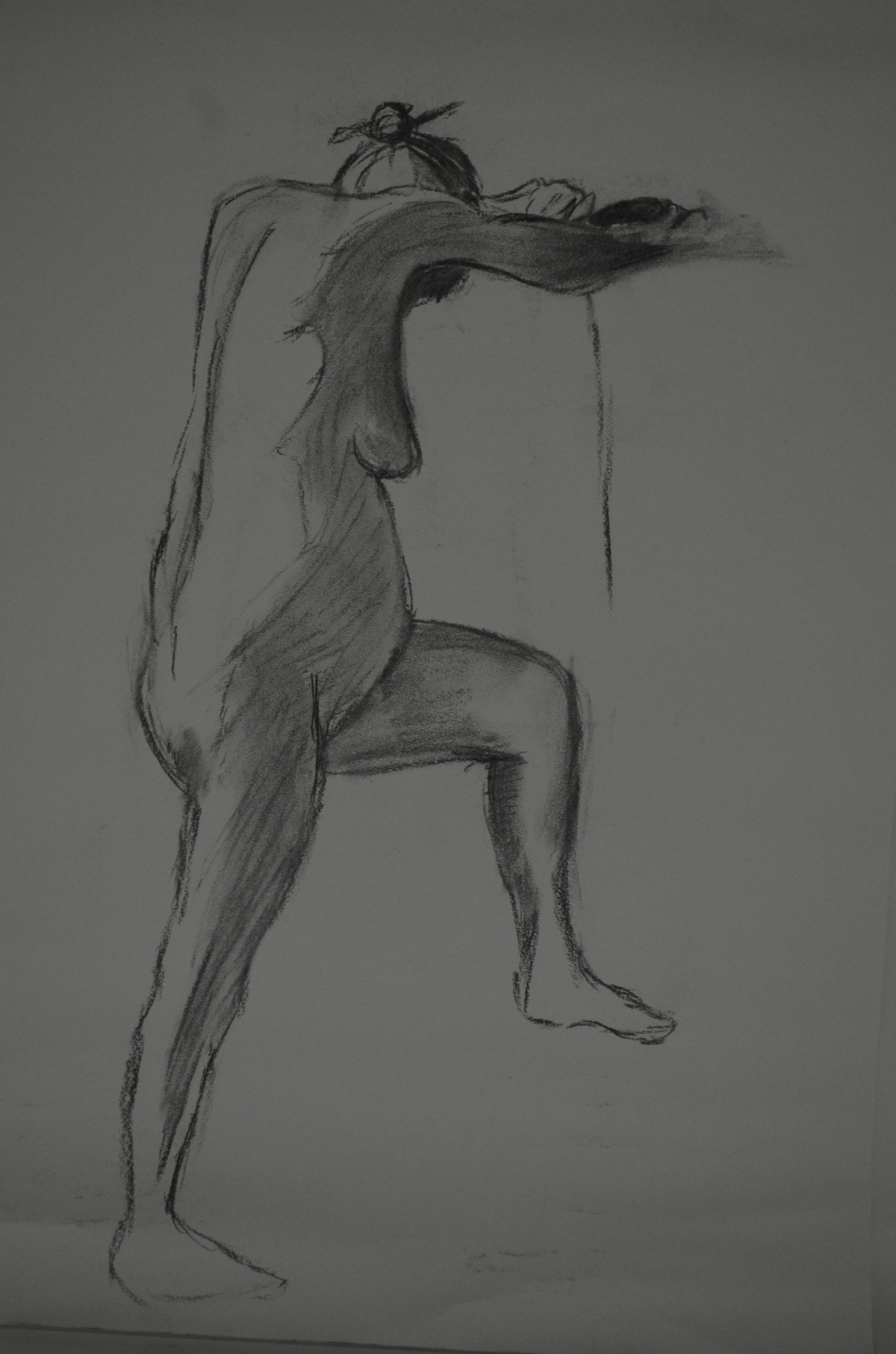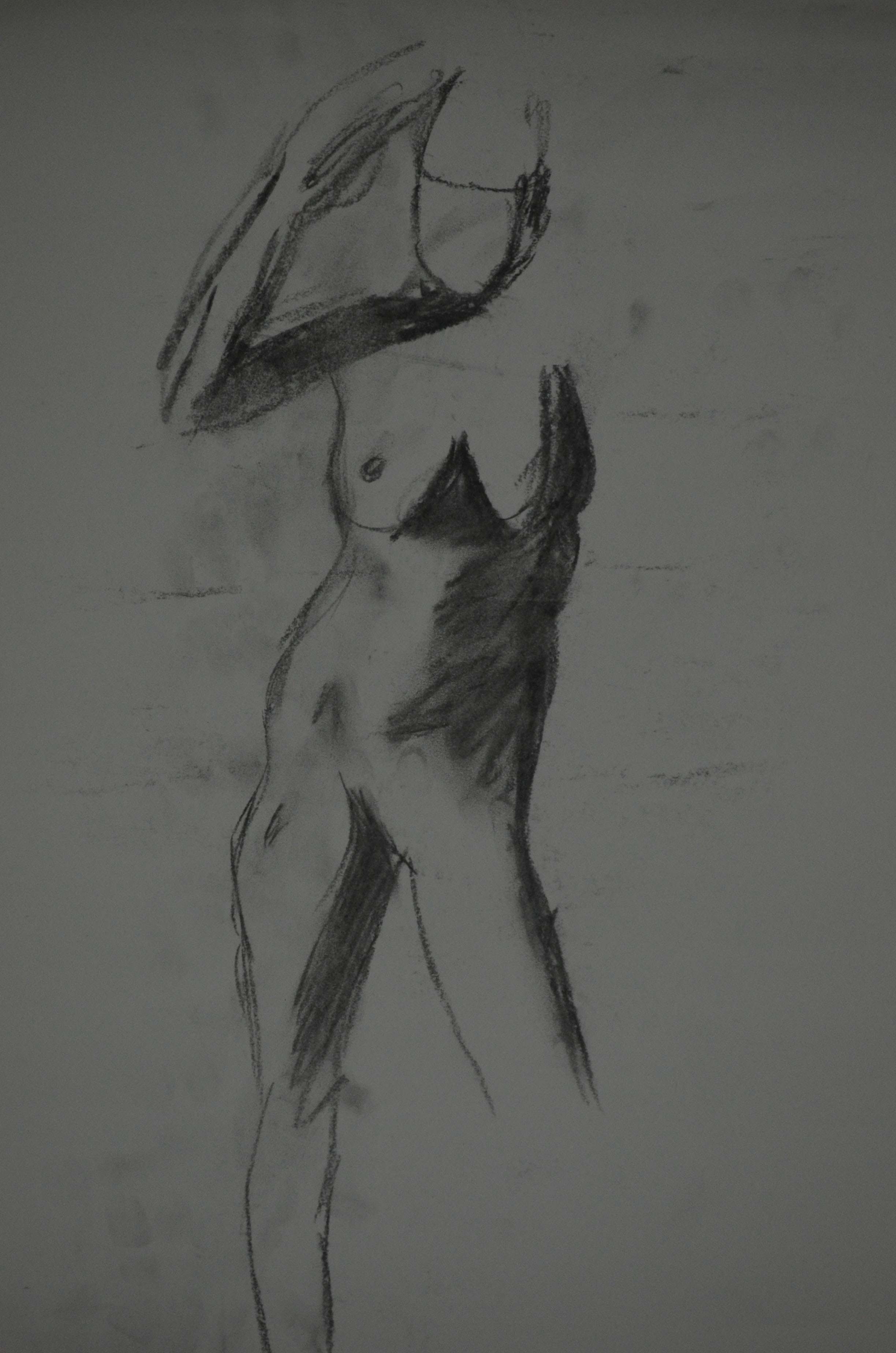 After choosing my medium, soft charcoal I set up my easel for the first pose which was a 15 minute pose. I was quite nervous and very self conscious, it being the first life drawing class I had ever been to and due to this I seemed to forget everything I had learnt and tried to hard to make a picture.
