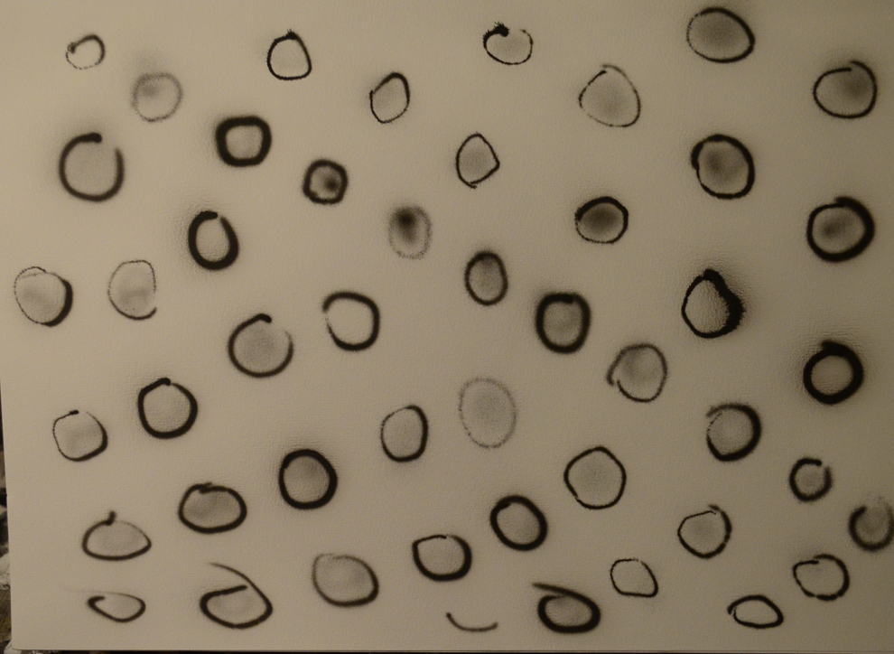 From there I moved my hand further away from the paper and attempted to fill the circles with a wider spray. Although I did mostly keep the paint inside the circles there were times where the paint came out uneven or didn’t touch the border lines at all.