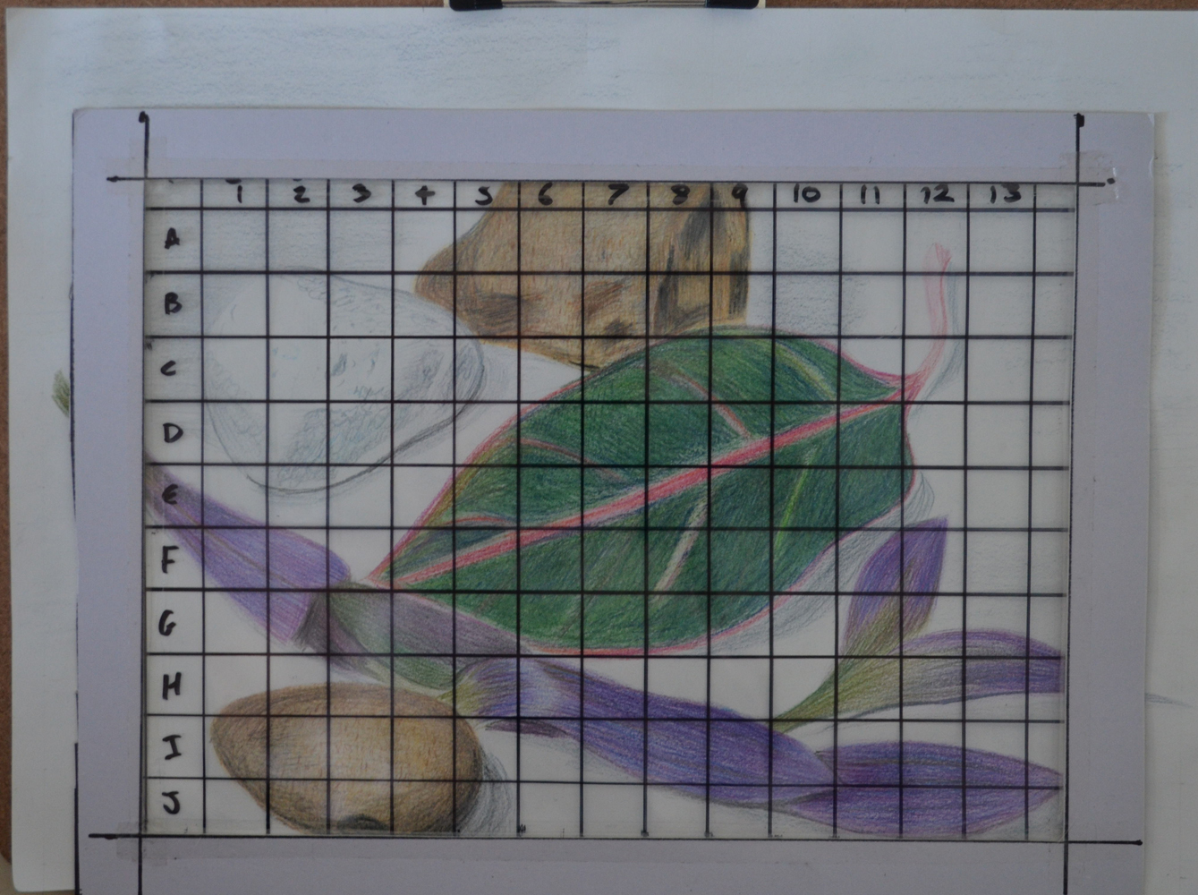 The natural object study has a balanced compositional arrangement and successful harmonic colour palette however I feel it has been cropped a little too tightly. The composition as a whole would benefit from a larger area of negative space, especially at the upper framing, around the pebble or rock in the background. The addition of this negative space would accentuate a sense of perspective or feeling of receding. Looking back on your preliminary work in relation to this piece I found that the compositional development sketch in colour pencil worked a little better. It has vivacity and more space to breathe and this I feel is missing from the finished piece. The development sketch possesses a more gestural and immediate rendering whereas the finished piece appears more guarded, as if you were slightly hampered or aware that it needed to be ‘finished’. The pressure we put on ourselves to produce something that is finished and ‘special’ can often hold us back, impeding a more direct and fluid representation.