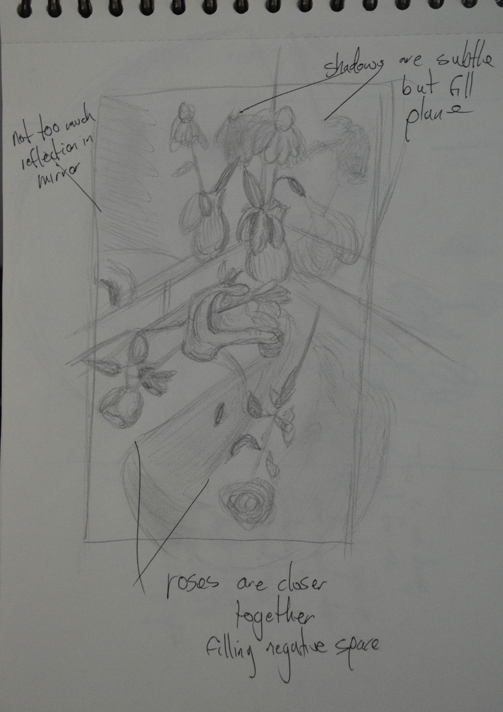 The subject you have chosen was undoubtedly an emotive one. Often these heartfelt themes can produce touching imagery and you have successfully done so with this piece. Firstly, I was greatly encouraged to see that you had diligently worked on multiple preliminary studies for the composition and had made detailed and clear annotation with regards ideas and working methodologies. The subtle colour palette utilised has a poignancy that works very well within its compositional arrangement. I was pleased to see that you had really thought about the narrative of the set up and had not fallen back on a conventional still-life arrangement. The placement of the still-life in a bathroom setting with its reflective surfaces of mirror, white ceramic tiles and porcelain basin was also a nice touch. This has strengthened the end result and added a tender feel to the piece, not to mention the inclusion of roses, which have an obvious relevancy. To be honest I feel your choice of working on white paper has worked for you – a coloured support would have made the drawing appear overworked and would have contradicted its intrinsic mood of sensitivity and restraint. It was good to read that you had used the influence of Antonio López García, an artist whose work I greatly admire. There is some very nice drawing here Mark. The delineation of form and reflective surfaces in details such as the tap and the apricot-coloured vase is very effective, as is your utilisation of the compositional device of the rule of thirds – a very well-considered piece.