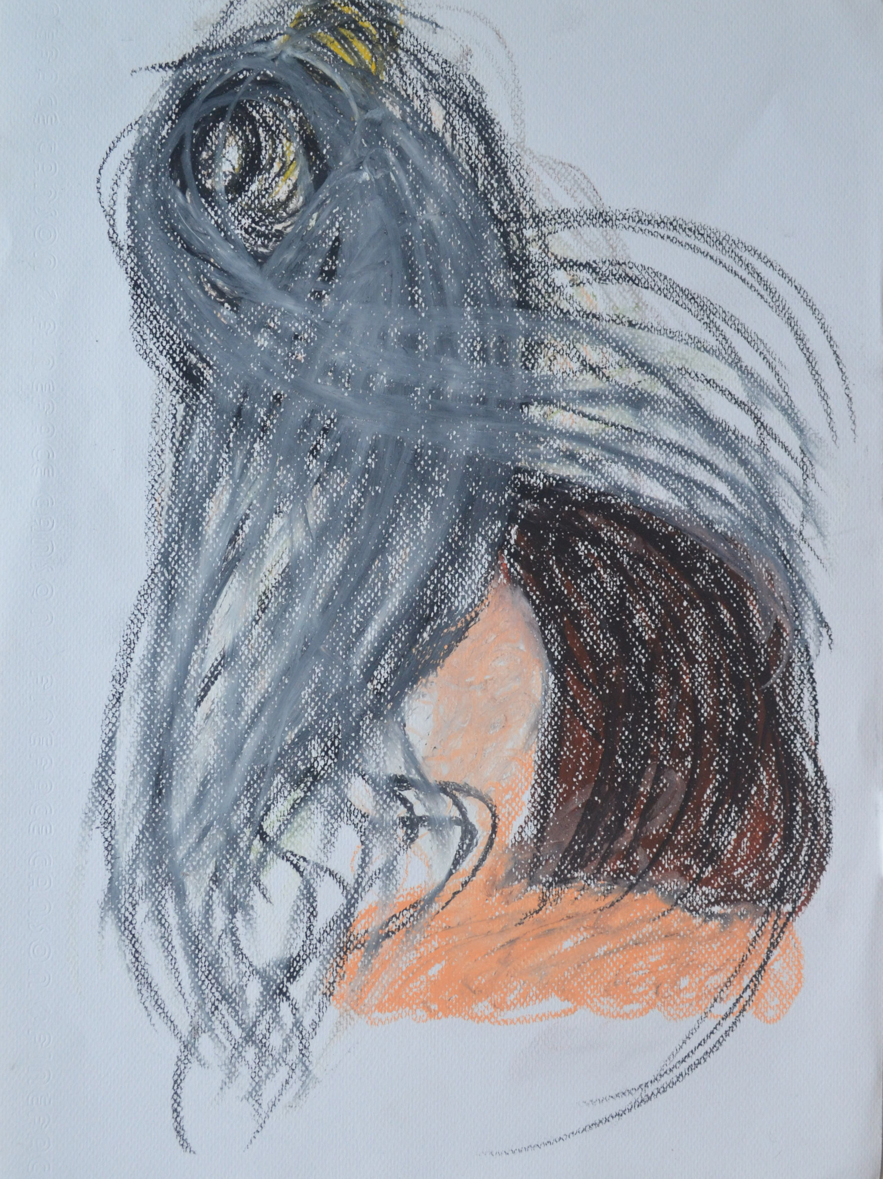 Two hours in and something was beginning to form but it was more like the blurred image in a dream than anything else. I started with black for the hair plus pinks and various oranges for the skin, cloth and skirting board then white circular swirls for the walls and floor, with the white lines further apart for the darker shaded areas to let the grey show through. I wasn’t hatching in the same circular motion for everything but I kept going over the top with white to give the impression of doing so and only two hours in I was already on my second stick of white oil pastel.