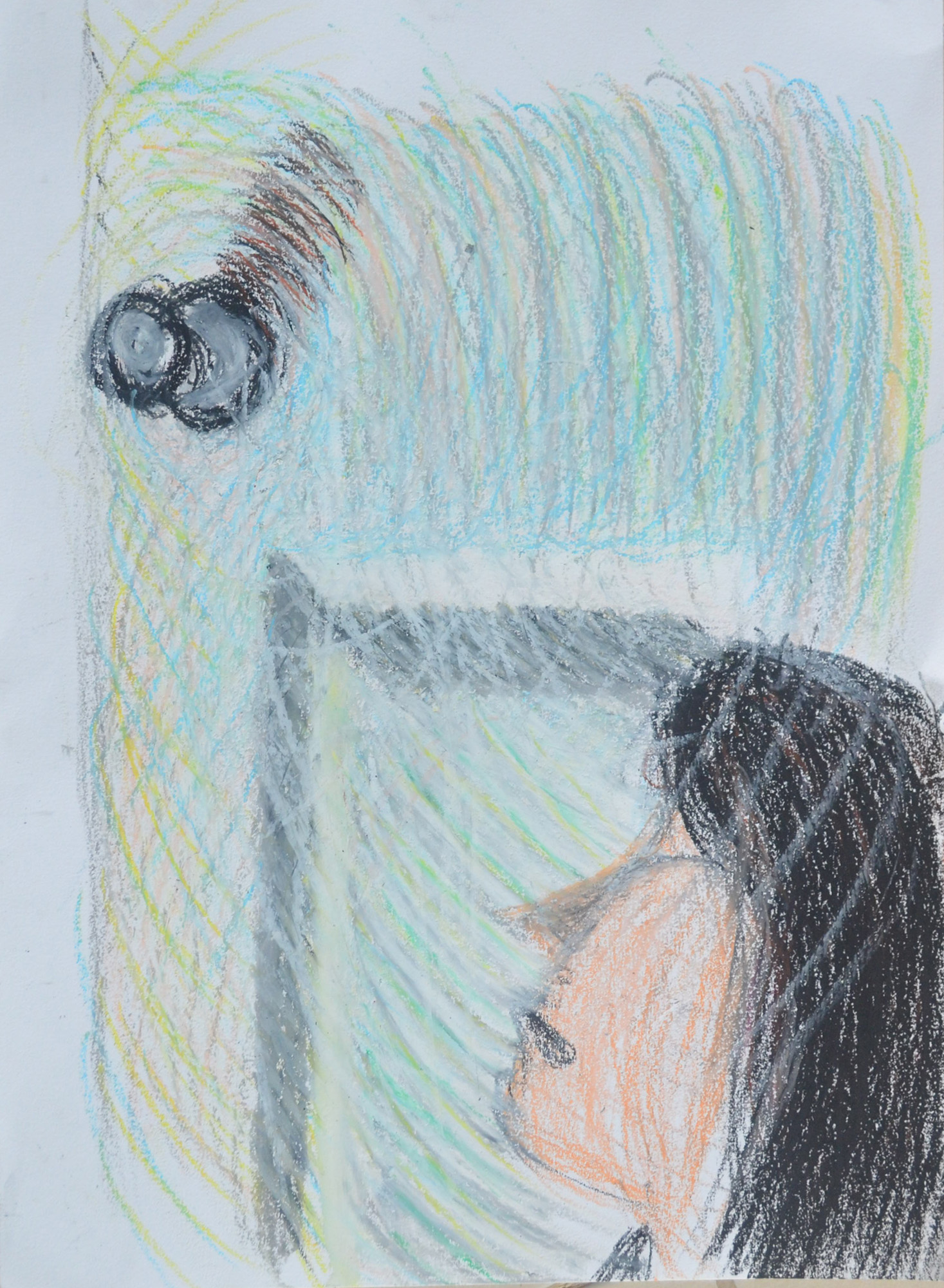 I knew I would need a lot of white oil pastel as I planned to draw it on an A2 size paper and so this was my first experiment at trying to get the lines that I needed without using the valuable white. I really don’t know what I was doing here and it started to look more like a kids drawing from an horror movie.