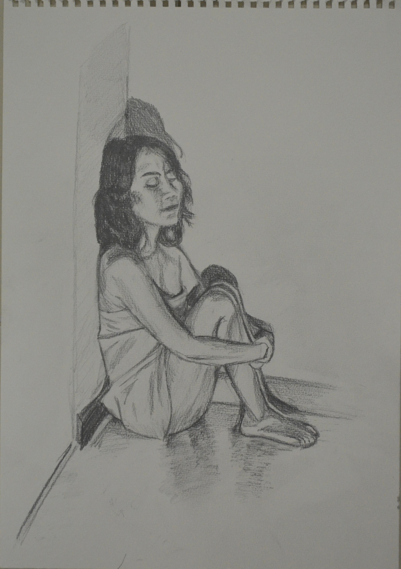 I was definitely including the background and I wanted to use the background to create a unique mood, to try and influence the drawing as much as possible. I imagined my subject sitting against a wall with long shadows depicting how small and insignificant she was to her surroundings, like Gerald Scarfe’s illustrations of the main character in Pink Floyd’s The Wall.