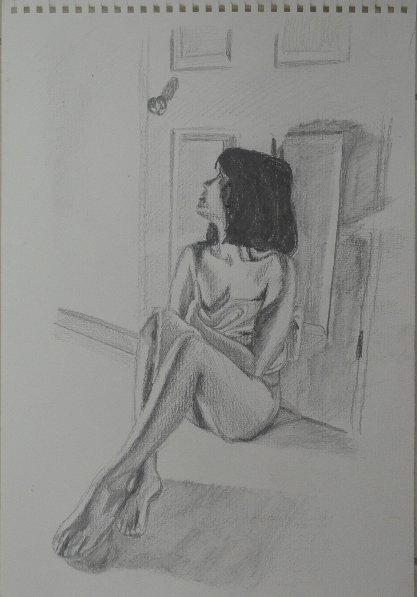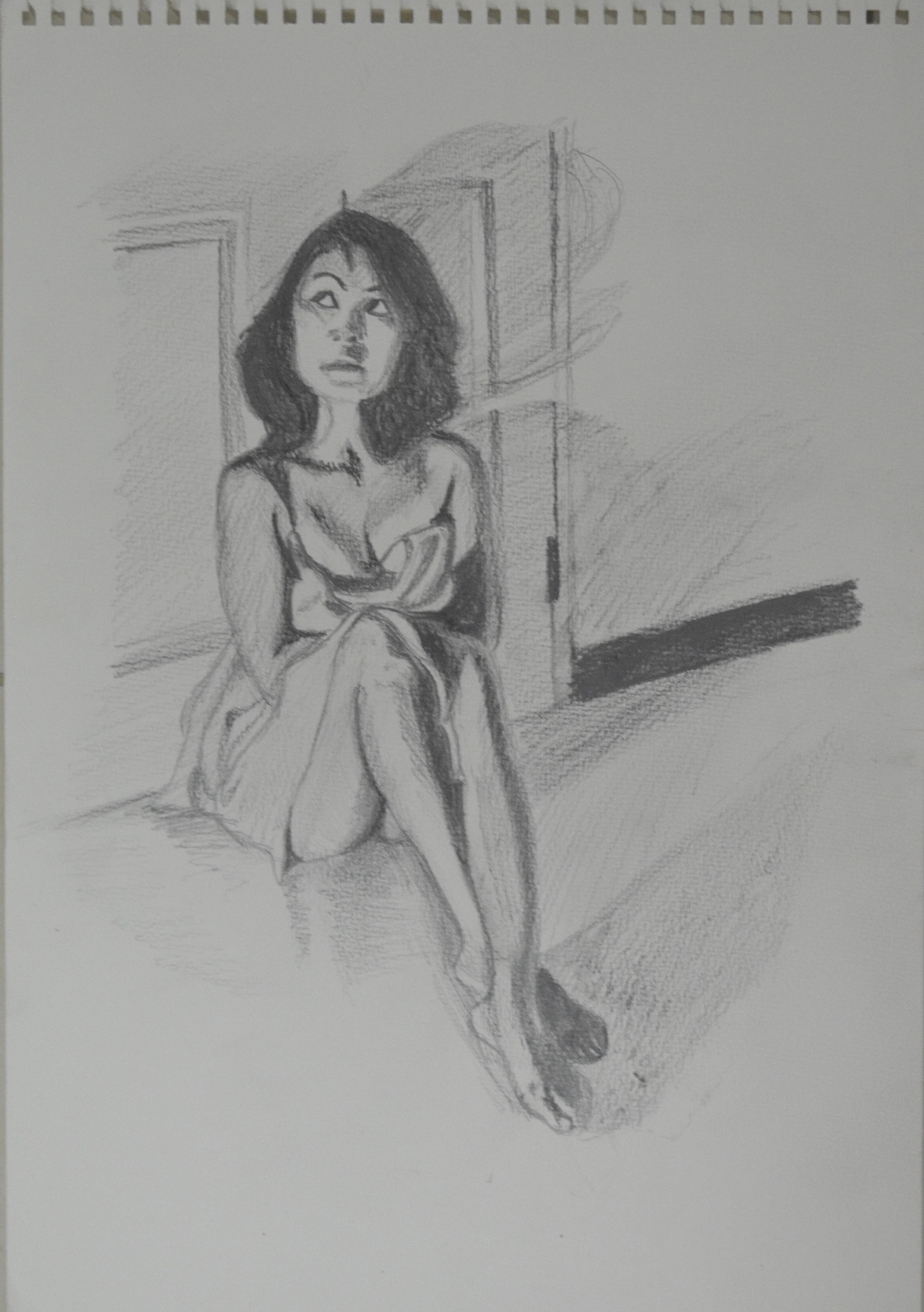 In this last sketch I decided I had got the pose that I wanted, it still looked like she was waiting for someone to come through the door rather than hiding behind it but I decided to go with it in the hope that the medium and technique that I chose to complete the assignment piece would help me to depict the mood that I wanted.