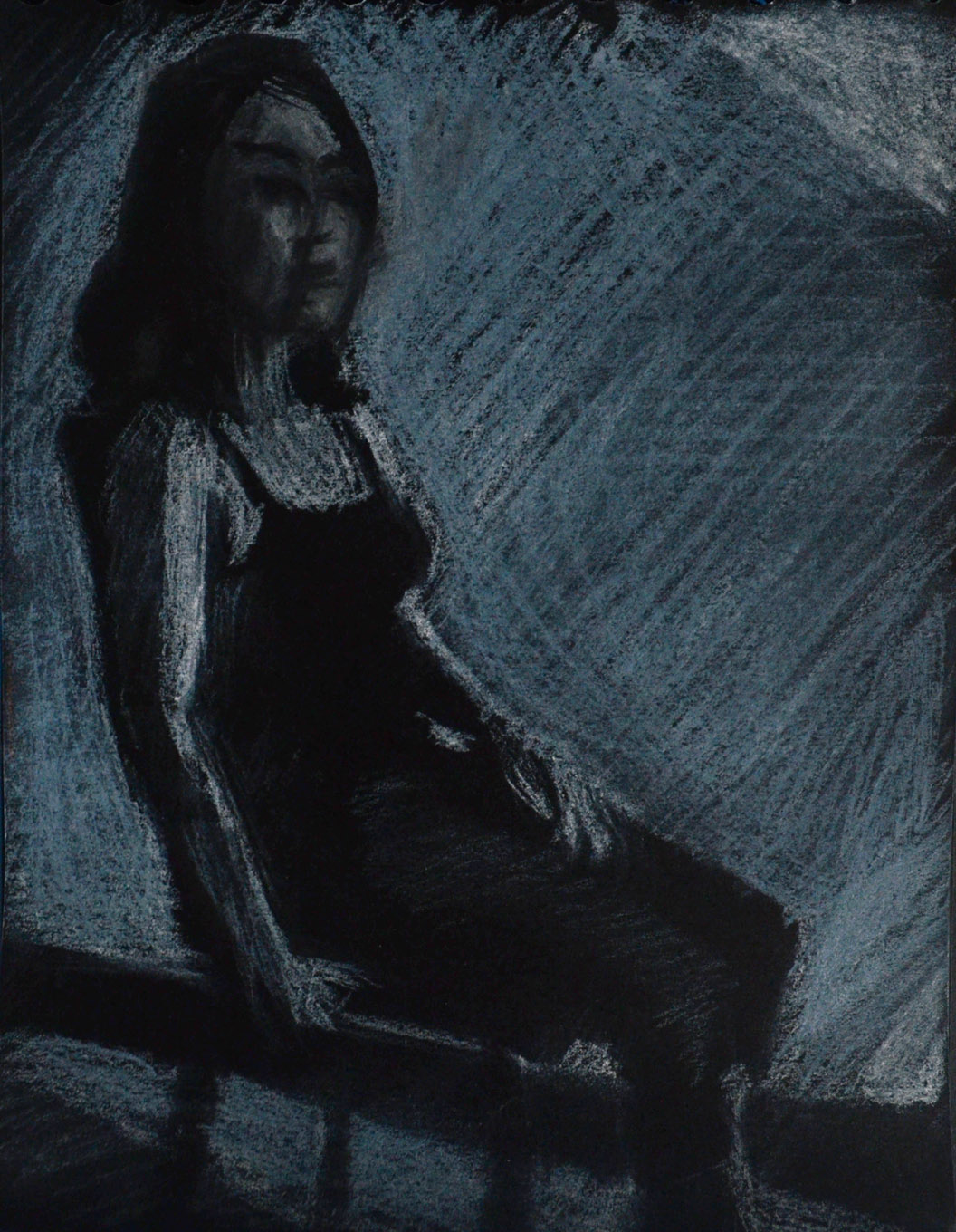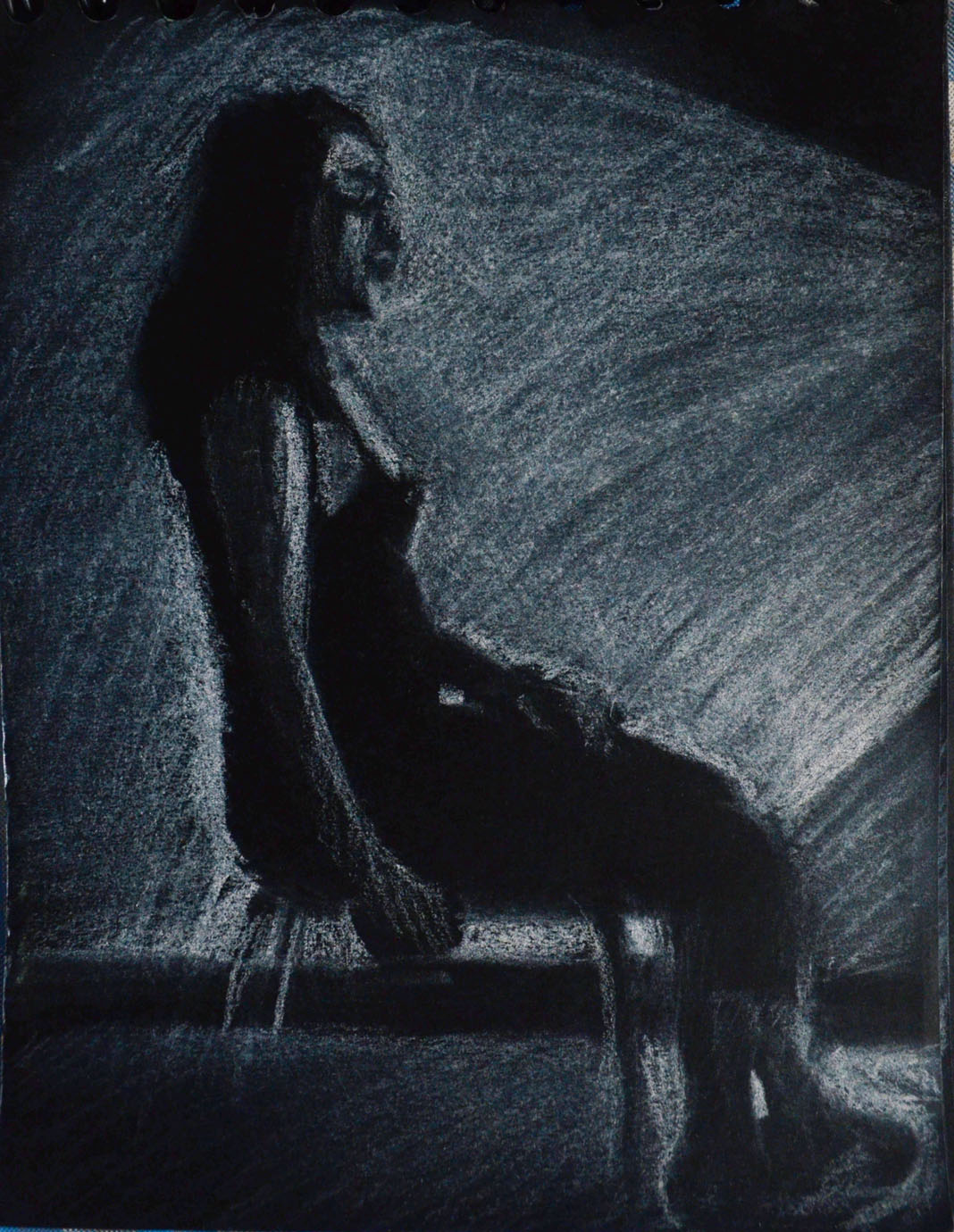 I started the next drawing by drawing in circles with the oil pastels and then blending them with my finger. I knew I would draw a figure over the top but i wasn’t sure which pose or how i would finish the experiment. I don’t know why I chose the pose below but it worked out well. To complete the drawing I first sprayed the bottom layer with hairspray then I drew the figure in a fine black marker before filling the figure in white oil pastel and then drawing in the details. I love the way her back glows due to the yellow in the centre of the bottom layer.