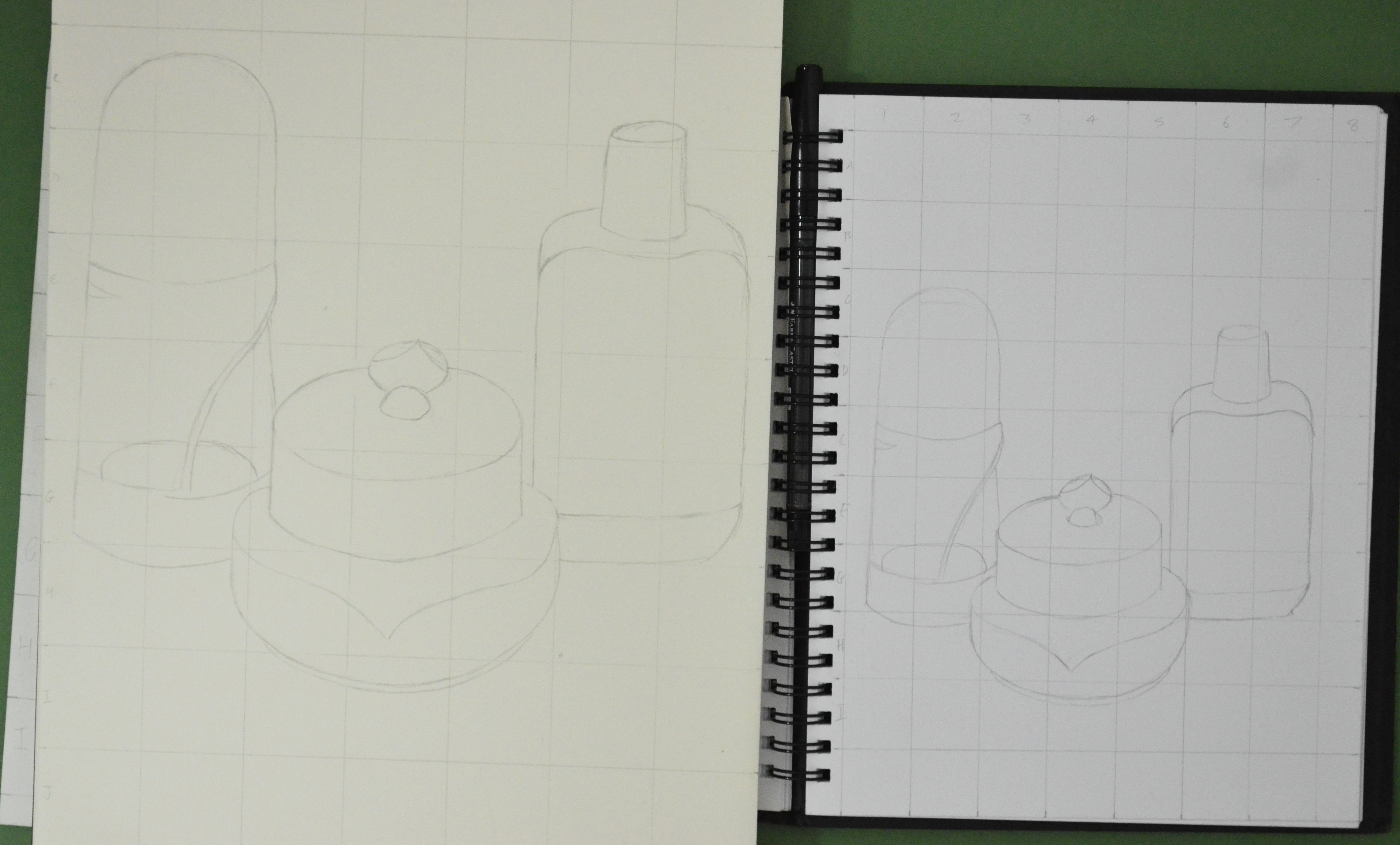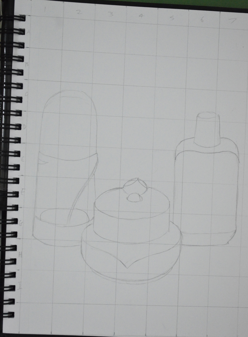 This exercise was aimed to give me further practice in enlarging original drawing with a slightly more complicated structure. For this exercise I chose a fancy jar of face cream (borrowed from my girlfriend), a roll on deodorant and a plastic Nasol bottle.