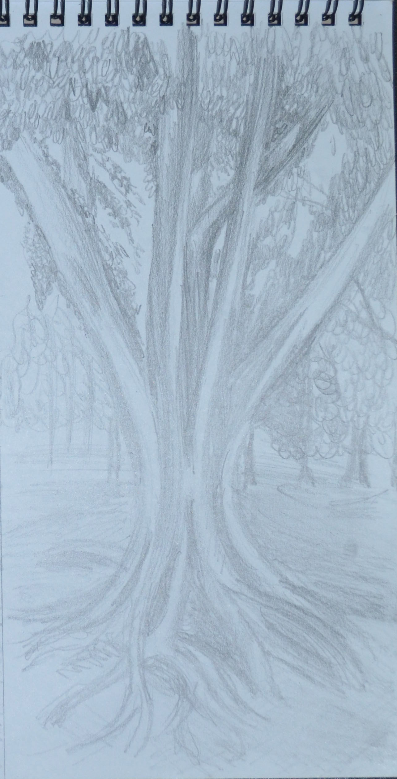 For the first sketches the light was above the folioge and so I showed light and shadow on the tree by way of hatching and yes I think I was successful. For the larger study of an individual tree the sun was behind the tree and so the whole of the tree was very dark but I depicted the light shining through the branches on the right by drawing the trees fainter than on the left. I don’t know how others will see it but it worked for me. I was going to use the putty rubber to show rays of light shining through but I sprayed it too soon.
