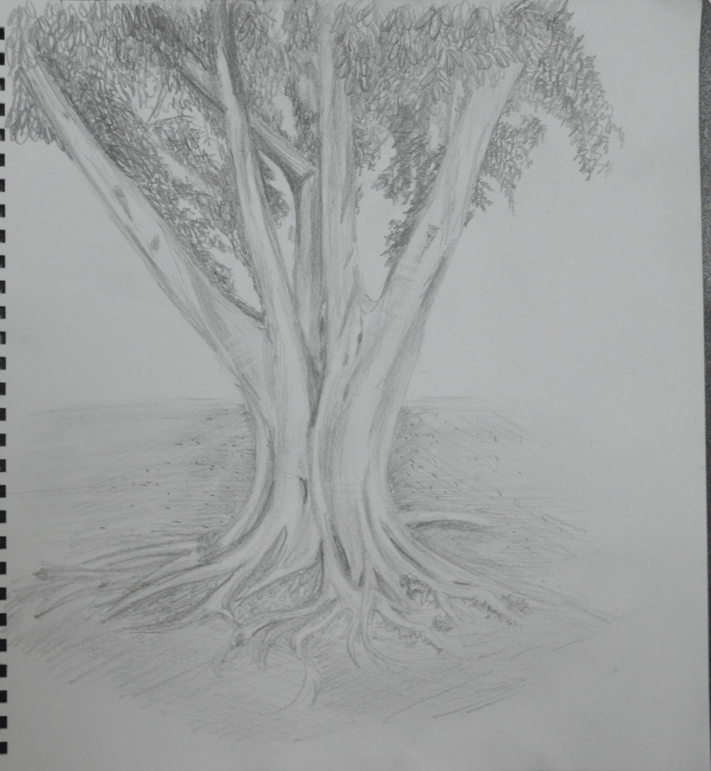 I’d say smoothing and hatching the first ‘Alien’ tree in the sketching individual tree exercise was very smooth like it was naked without bark. So smooth that you could see the stretch marks in the tree so for this tree I used very fine hatching, smoothing with my finger and erasing with the putty rubber. For the individual Banyan tree I used more hatching and did less smoothing but with the study of several trees it was all very rough hatching with oil pastels.