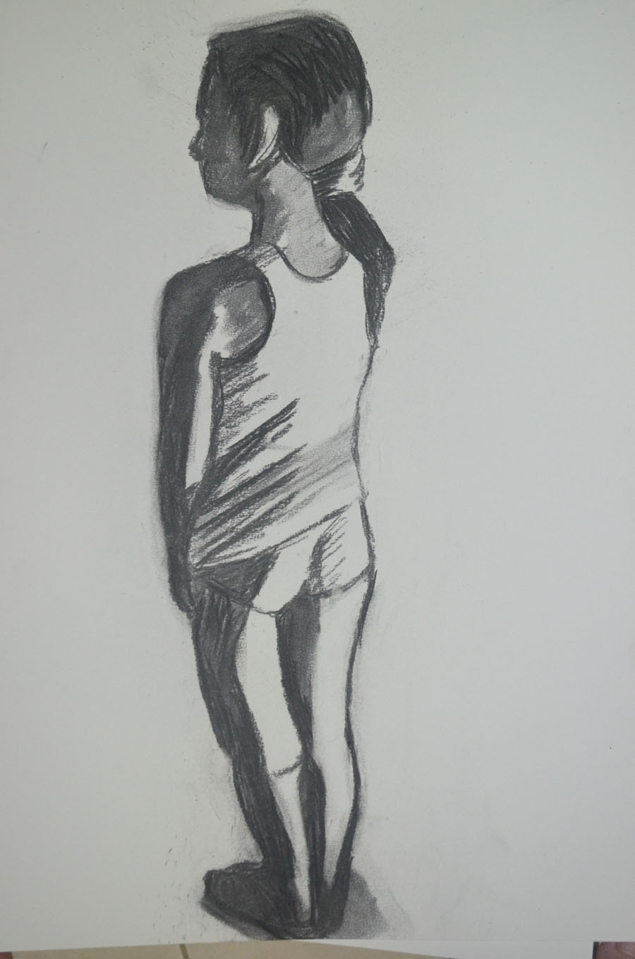 I went back to charcoal on A2 for the final drawing and if the profile looked anything like my daughter I might have been somewhat satisfied but looking at the second picture then looking at this one you can see how the legs are too short and the head looks big, I’m not sure whether it’s the angIe am at or I started out to broad.